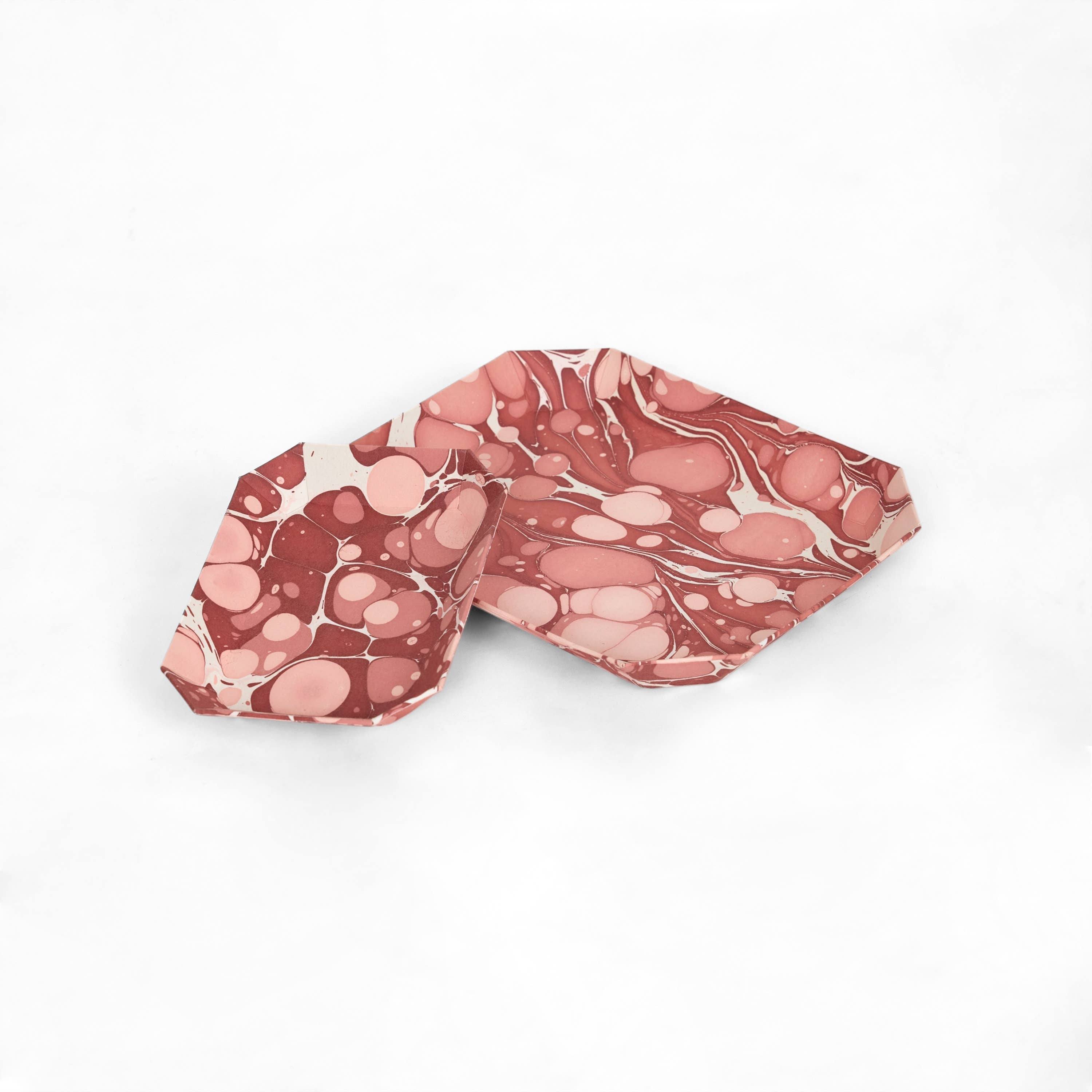 Description : A perfect space for extra pencils, small notes. Suitable for desk spaces, the table next to your front door, bedside table, anywhere that requires a little organising. Recycled Cotton Handmade Paper Tray Sets are made by Master Artisans who have been creating vintage style boxes and cartonage products for generations in Jaipur. The Paper design is Hand Marbled. Produced in Small Batches only. Designed to Inspire a home filled with Artisanal Slow Living Objects. Set of Nested Small and Large Tray Size : 4.5" x 9" x 1" Material : 100% Recycled Cotton Paper
