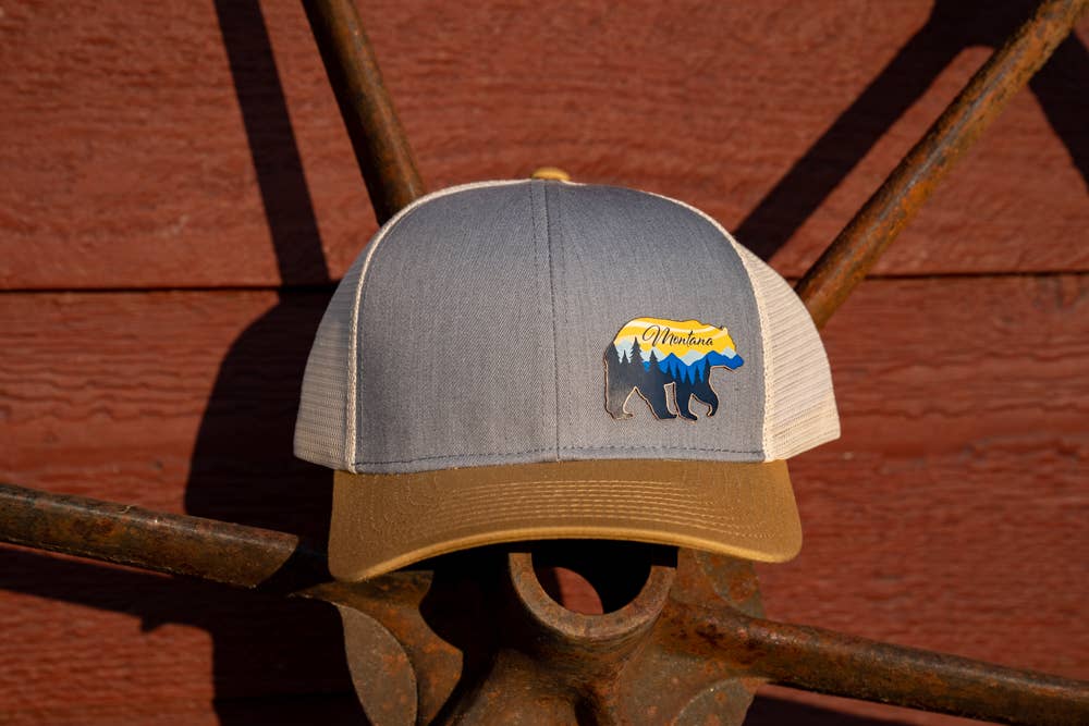 Laser cut and engraved leather patch applied to a custom printed floral mesh back snapback. These can be customized with any state or even logo. Please message us if you have any questions.