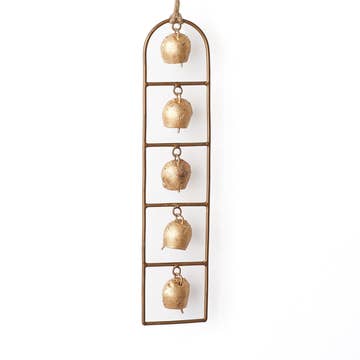 Take a well-deserved break during your hectic holiday rush and relax with the soft, soothing tone of this durable chime. Suspended from a center chain, four wintry pines fashioned from recycled iron feature festive star cutouts. Each tree is adorned with petite brass bells and green glass beads that evoke a sense of tranquility and peace. The charming design is finished with a larger bell that extends from the trunk of the bottom tree. Beautifully handcrafted exclusively for Ten Thousand Villages by artisans with the Asha Handicrafts Association. Sanskrit for "hope," Asha provides opportunities for artisans in and around Mumbai. Materials: Recycled iron, glass - Measures: Approximately 35"L - Colors: Brass, green - Handcrafted in India