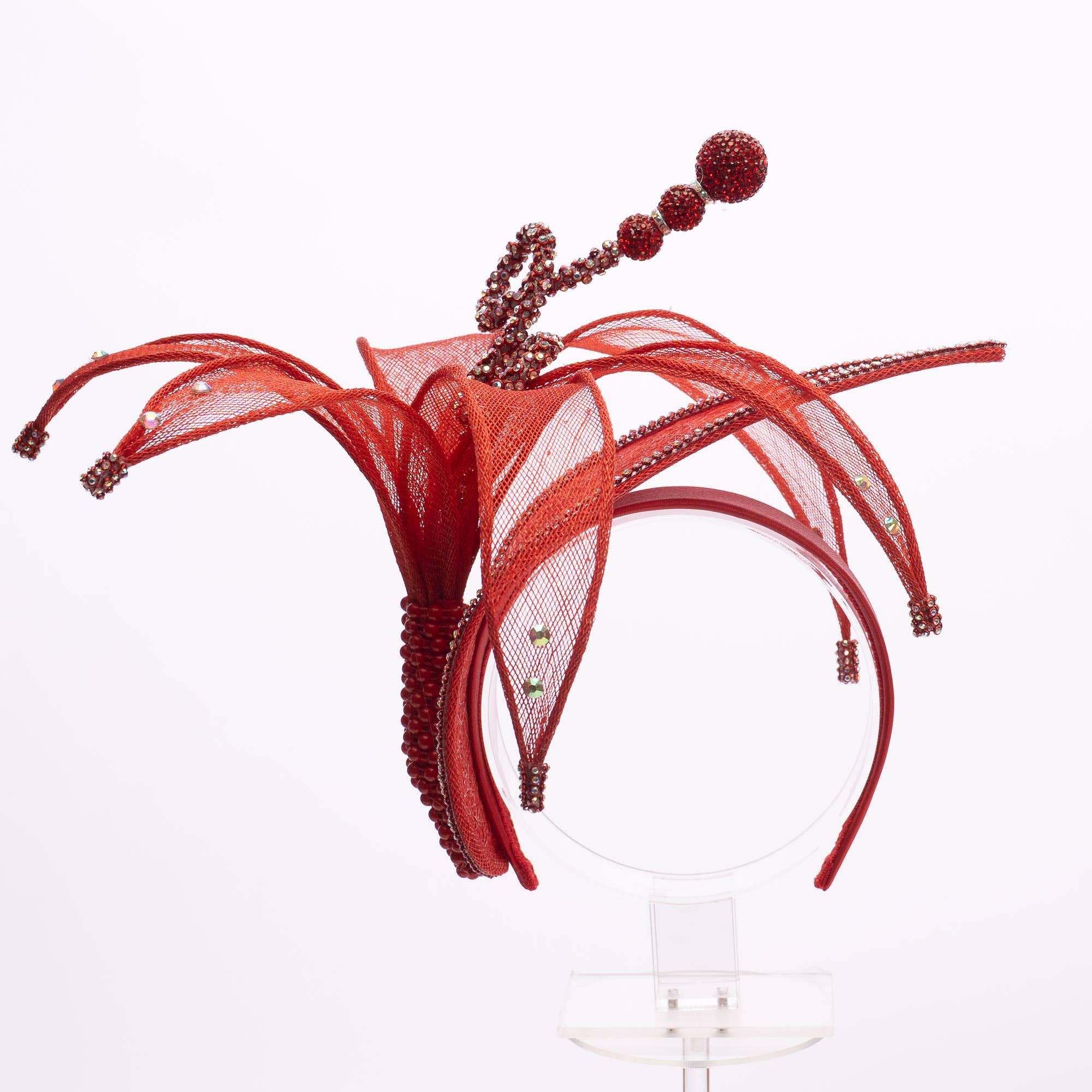 "This exquisite fascinator, crafted from premium Sinamay fabric, is adorned with shimmering stones and elevated with a chic partial face shield, designed to turn heads and deliver that unforgettable ‘wow’ factor."