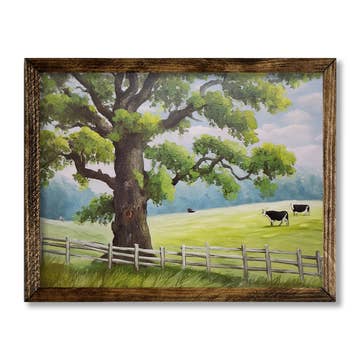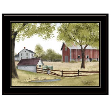 BJ217-704G "The Old Spring House" by artist Billy Jacobs, in a stylish 19" x 15" black frame. This pastoral theme art features a farm house, red barn, and a primitive wooden fence leading up to the old spring house, adjacent to a natural wet lands area of the farm. Two trees in summer foliage round out this art which is reminiscent of a by gone era when refrigeration was scarce. This framed art is totally American made. The surface of the art is coated with a fade resistant texture which gives it a canvas-like appearance. No glass is necessary. Arrives ready to hang.