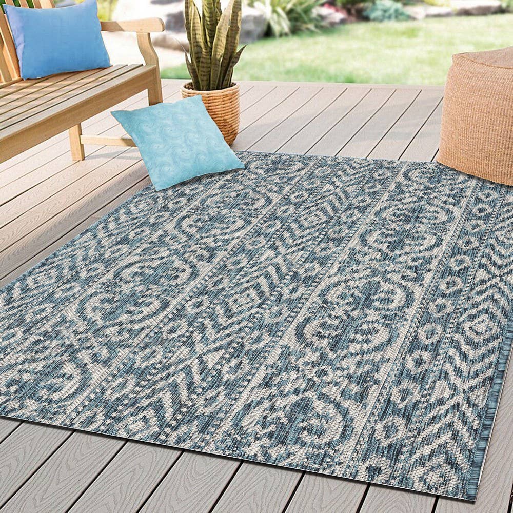 Accent your living room, dining room, porch, deck, or patio, with this indoor/outdoor area rug. Meticulously crafted from dozens of recycled plastic bottles, this rug is surprisingly soft while proudly being environmentally friendly. Featuring a high-low pile height in neutral colors, it will add dimensions to any of your rooms while effortlessly blending in with the rest of your decor. Bring this piece of floor art home and see it add life to your space in an instant. Machine-Made in Turkey 100% Recycled P.E.T. Available Sizes: 5' x 7', 7’10”x 8’10” Available Colors: Light Blue/Ivory Style: Southwestern, Transitional/Casual Pattern: Chevron, Geometric Pile Height(in): 0.35