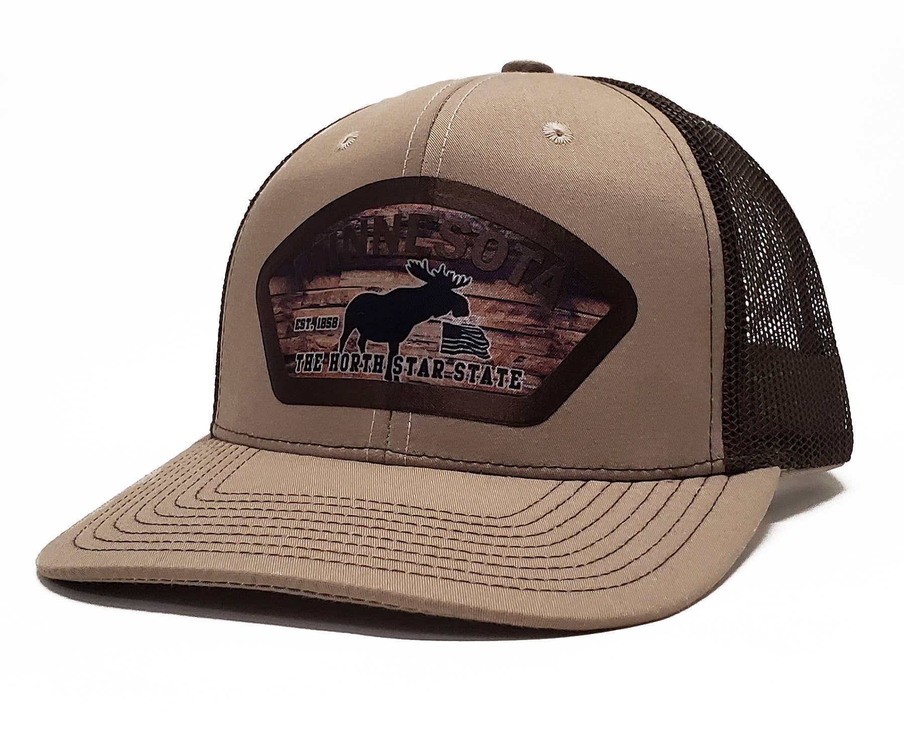 laser engraved patch, black distressed hat front, printed mesh, snapback adjustable closure