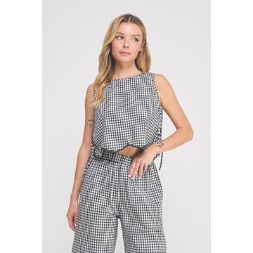 CHECKERED DENIM SLEEVELESS BUTTON-DOWN SHIRT AND LONG PANTS SET Model is wearing Small Height: 5'9" Bust: 32B Waist: 24" Hips: 34"
