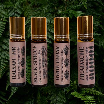 These oil rollers are made with quality essential oils in my signature blends: Root, Shield + Prosper, Forest Mist, Jera, and Third Eye. The carrier oil is coconut oil. Bottles are glass, 10ml, with a metal ball for oil application. ROOT: Lavender, Patchouli, Eucalyptus, Amethyst, Rose Qartz SHIELD + PROSPER: Pine, Atlas Cedar Wood, Peridot, Black Tourmaline FOREST MIST: Sandalwood, Patchouli, Texas Cedar Wood, Clove, Peridot, Carnelian, Black Tourmaline JERA (good fortune + abundance) : Bergamot, Orange, Cinnamon, Carnelian, Peridot THIRD EYE (meditation + spirit connect): Sandalwood, Cedar, Frankincense, Rainbow Moonstone, Amethyst Please only use this product if you are not sensitive or allergic to any of the ingredients.