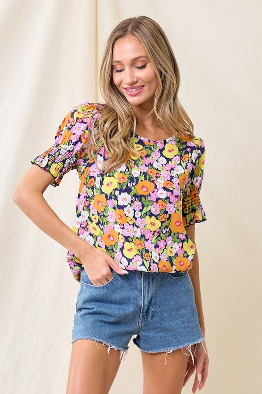 Front String Detailed Printed Mesh Top V-neckline Short cap sleeves Ruched front with drawstring -Model wears: S / Model height: 5` 9"