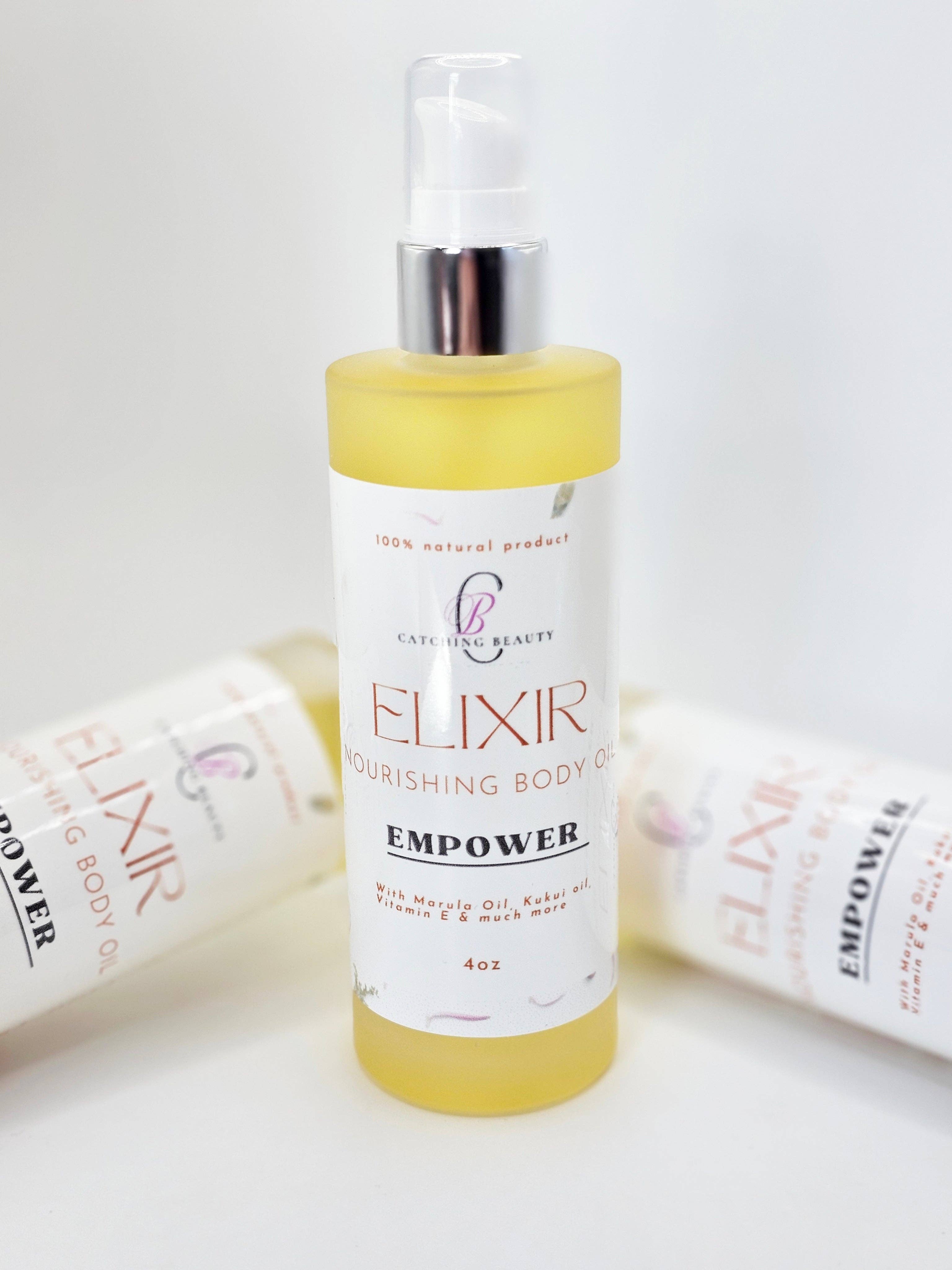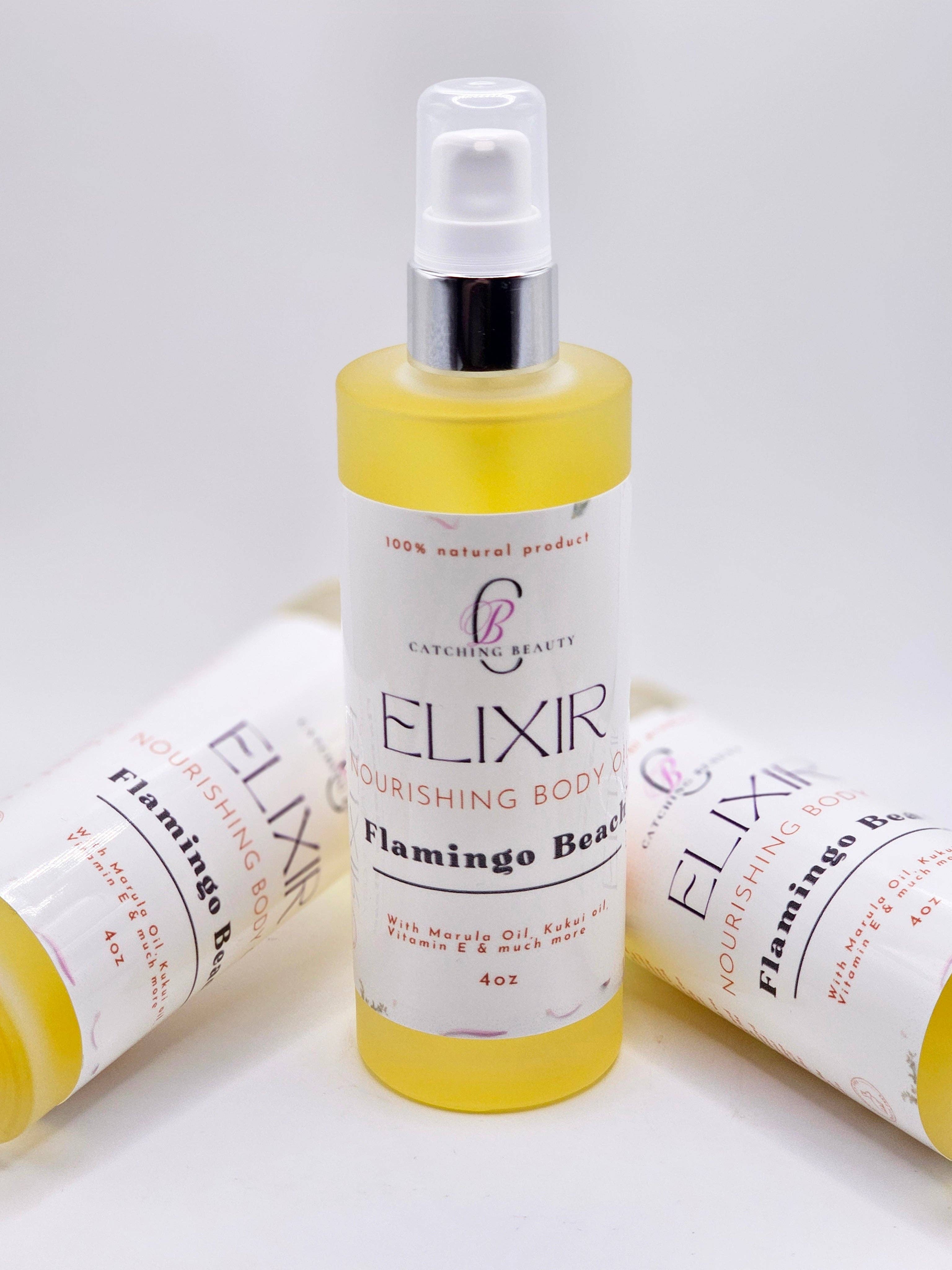A complex yet clean combination of blue agave, dune grass, beach driftwood, fuji apple, kaffir lime, dewy cyclamen and amber. We were inspired by our loving customers who already love our facial skin thirst oil to create beautiful and unique smelling body oils with outstanding skin nourishing oils they can apply daily to help release their inner goddess. So our skin ELIXIR was born. After researching and incorporating only the best natural oils together we've created not only a high end body oil for a great price but with unique fragrances that will linger on you all day. Try it and wait for the \"You smell great\" compliments to roll in. INGREDIENTS: Avocado oil, Sunflower oil, Marula oil, Vitamin E oil, Rosehip oil, Kukui oil, Jojoba oil, Fragrance oil.
