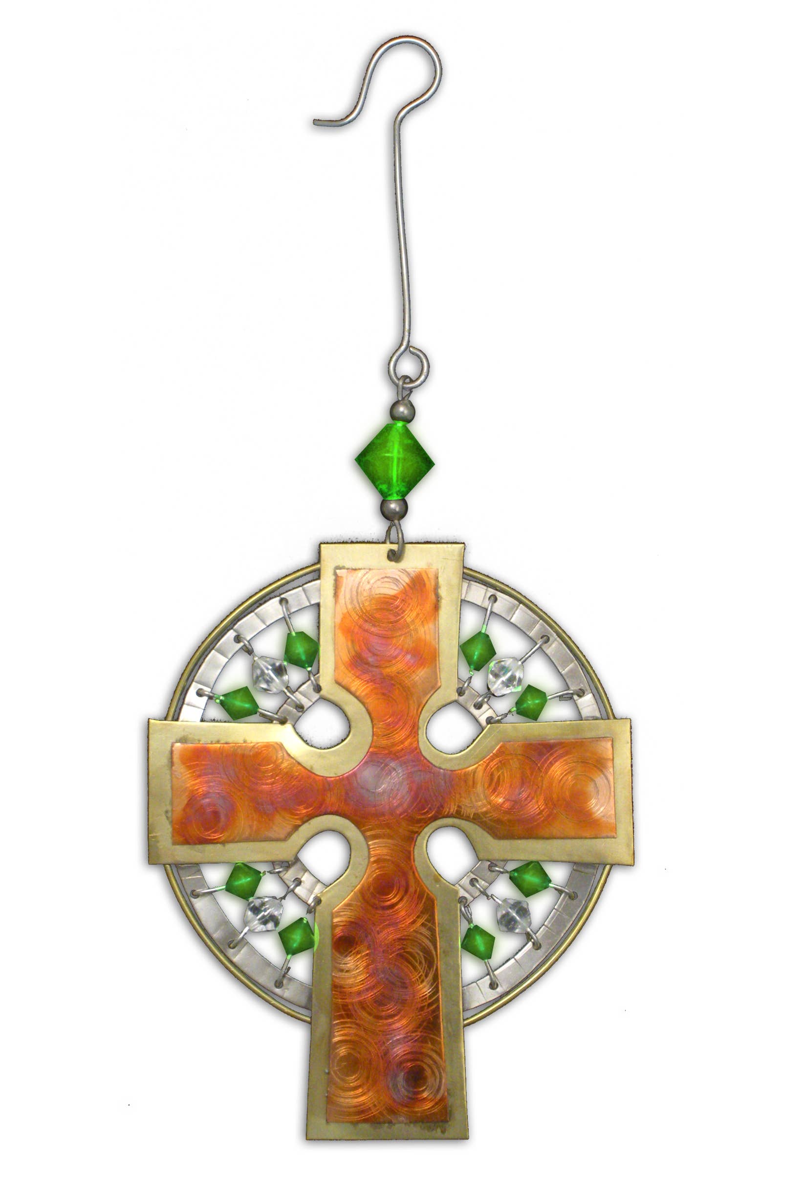 Oval shaped ornament crafted of MDF in muted green tones. Featuring metal Celtic cross symbol in silver enamel finish on the front, with story of the cross on the reverse side. Hangs from satin ribbon. 2 ½” W x 3” H x ¼” thick. Window boxed.