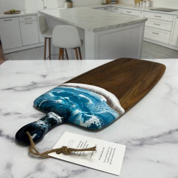 Indulge in the sophistication of our Walnut Charcuterie Board. Crafted from premium maple, this cutting board features elegant blue and teal waves. With a convenient cutout, it can be displayed as a work of art in your kitchen. Elevate your dining experience with this exclusive piece. 11" x 6" x 3/4" Option to add Personalized Engraving. Font options displayed in photos. We can also engrave a company logo for $7.50/item. Please message us for more info.