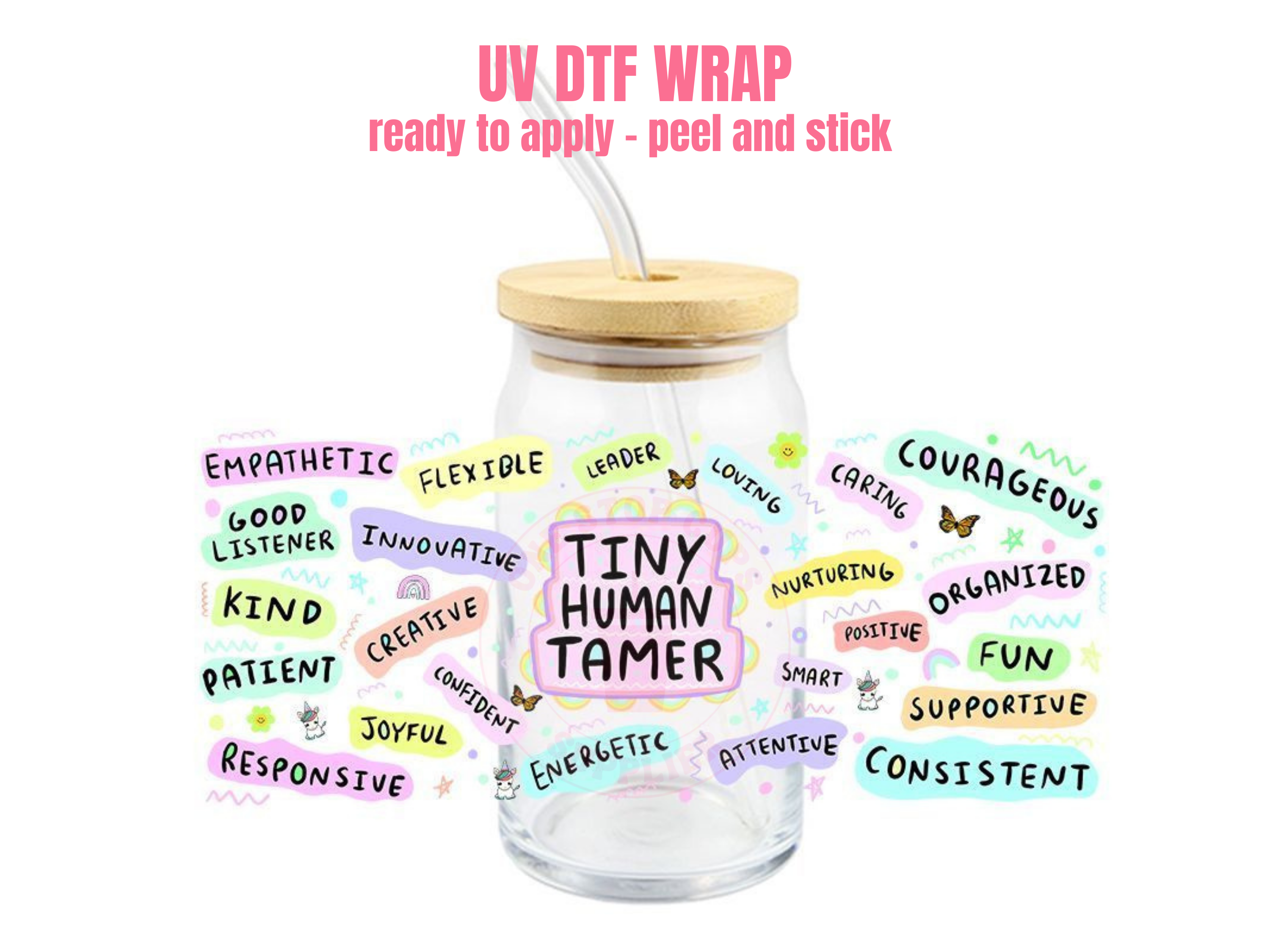 PRODUCT DETAILS This listing is for one (1) UV DTF adhesive cup wrap for a 16oz Glass Cup size. Size of transfer wrap: 9" x 4 " Glass cup NOT included.
