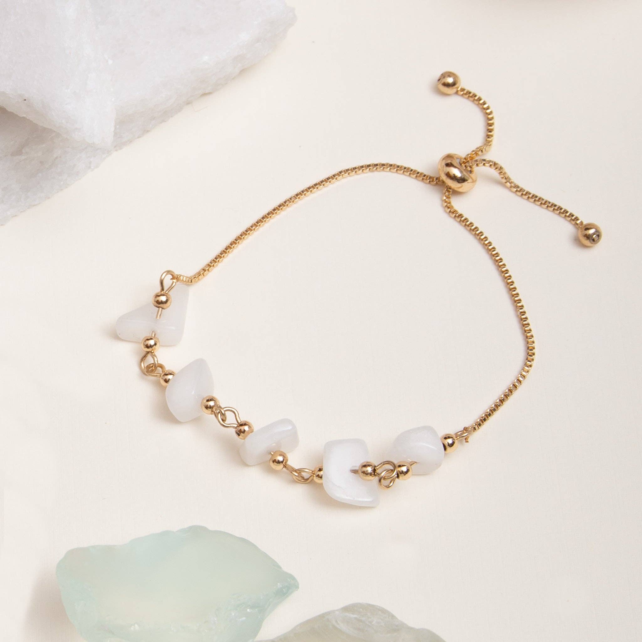 Details: - bracelet set (includes 2 separate bracelets) - stretches to fit most - made with natural pink opalite - gold plated - hypoallergenic, nickel and lead free - anti-tarnish coated