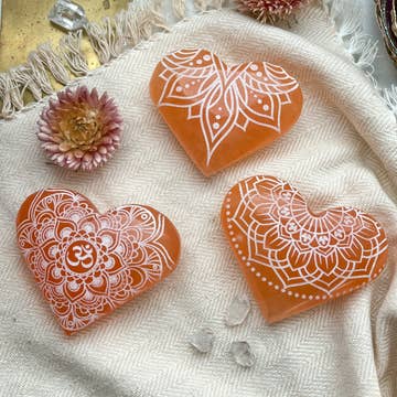 These lovely naturally orange Peach Selenite Hearts are expertly laser-engraved with beautiful henna and mandala designs. These make wonderful Valentine's Day or Mother's Day gifts for women! Select your size and designs below.