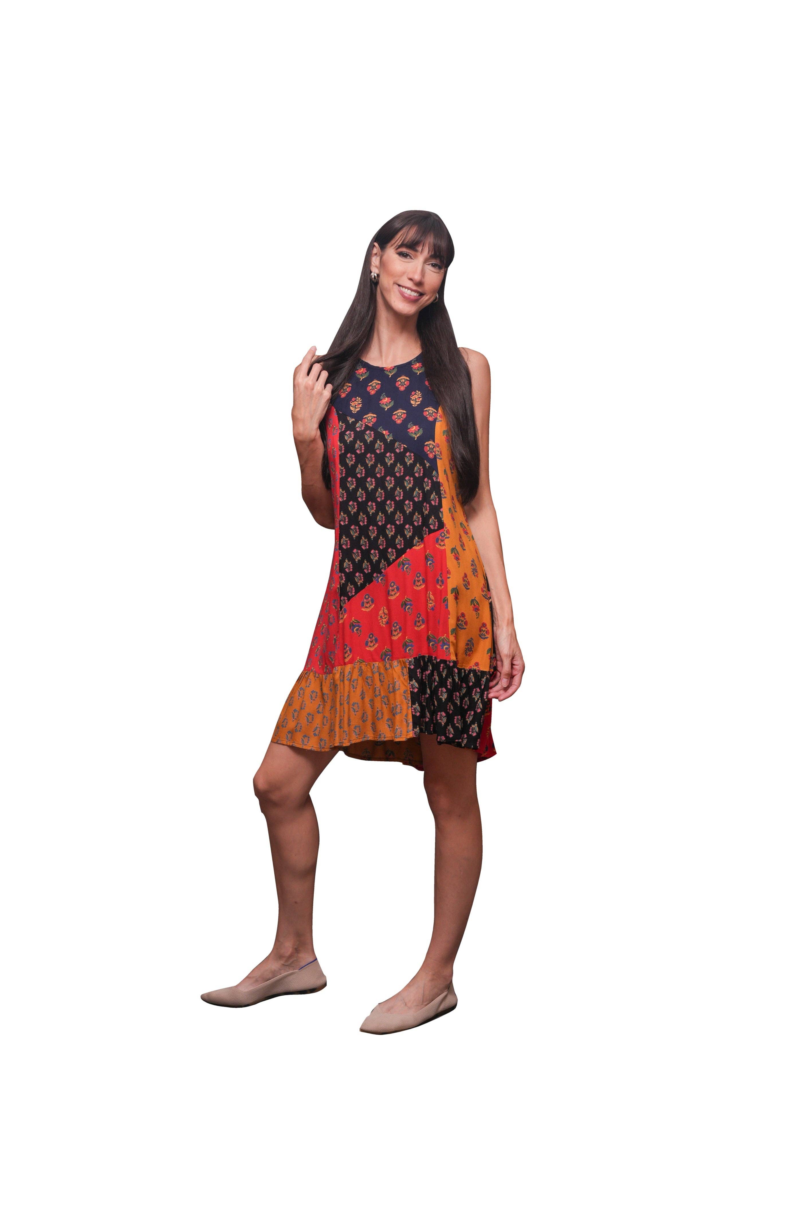 SKU: 224195 Made in India Aesthetic: Bohemian and Casual Care Instructions: Machine wash Color: Multi-Colored Dress Style: Sheath and Sundress Fabric: Rayon Fit: Contemporary and Junior Occasion: Everyday and Holiday Pattern: Patchwork Season: Spring/Summer Skirt & Dress Length: Mini Product Language: English Weight: 226.8 g (8 oz) Production: Ethically sourced and Fair trade