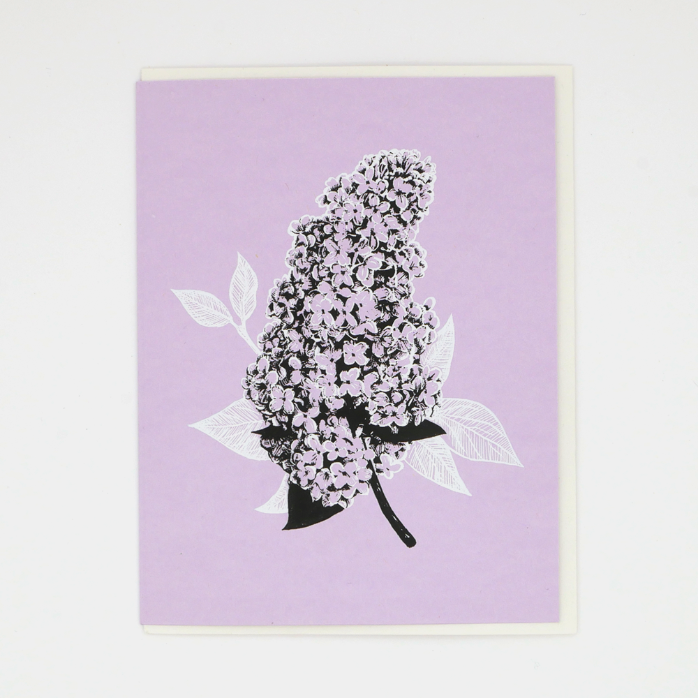 Digitally printed A1 (3.5" x 4.875") greeting cards featuring a linocut of foxglove flowers with leaves. Cards are blank on the inside and include matching envelope.