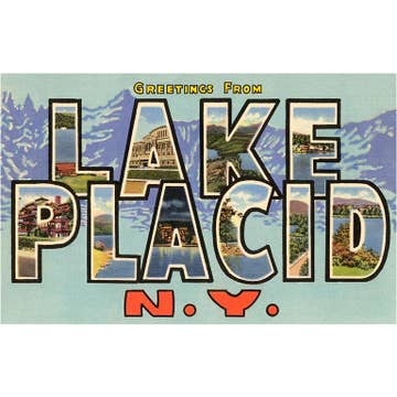Size 4-5/8" x 3-3/8" Image Description: a dark green map motif sticker with the white text Adirondack Park across it, little white text in spots say "NEW YORK" "LAKE GEORGE" "LAKE CHAMPLAIN" "MOOSE RIVER" "GREAT SACANDAGA LAKE", along with little white motifs of trees, mountains and animals All images, products and designs © Noteworthy Paper & Press