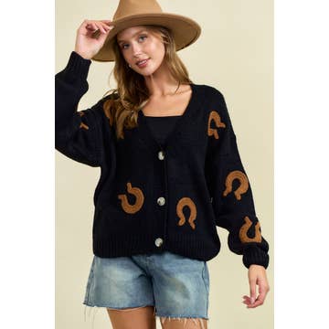 * Style No.:BBIWJ5359LL-B Classic charm meets effortless style in this horseshoe graphic long sleeve round neck cardigan. Designed for those who love a touch of western-inspired flair this cozy knit piece features a bold horseshoe graphic adding a unique and lucky charm to your look. The soft breathable fabric ensures all-day comfort while the relaxed fit and button-down front make it a perfect layering essential. Pair it with denim and boots for a rustic-chic vibe or throw it over a dress for a trendy contrast. horseshoecardigan westerninspired effortlesschic cozyandstylish layeringessential statementpiece trendyknit casualelegance polishedcasual musthavepiece timelessstyle elevatedfashion boldandunique stylishcomfort rusticvibes fashionforward