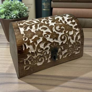 Hand-Carved Elephant Keepsake Chest Size: 12" x 8" x 4" Rectangle Material: Mango Wood Hinged lid with deep storage space Bring timeless artistry and symbolic meaning into your space with this beautifully hand-carved mango wood box, featuring an intricate elephant and tree motif on the lid. In many cultures, the elephant represents strength, wisdom, protection, and good fortune—making this piece both meaningful and decorative. Crafted from sustainably sourced mango wood, each box is carved by skilled artisans, revealing the natural grain and warm earthy tones of the wood. A sturdy metal latch and hinged lid keep your special items safe, while the spacious interior makes it perfect for storing jewelry, letters, crystals, incense, keepsakes, or spiritual tools. This statement piece adds a touch of old-world charm to any dresser, altar, shelf, or coffee table.