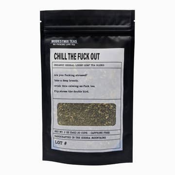 $8.25 per bag wholesale | $16.50 per bag MSRP | 2oz loose leaf tea per bag We love this deliciously complex and well-rounded blend that helps chill you out. We paired exotic cardamom with yummy marshmallow and licorice root...mixed in a hint of mint as well as ashwagandha to remove stress and gotu kola to help you gain more clarity. This blend is truly fanfuckingtastic. Are you fucking stressed? Take a deep breath and drink this calming-as-fuck tea. Flip stress the double-bird. *Statements made on ModestMix.com regarding the herbal and natural teas offered have not been evaluated by the food and drug administration as the FDA does not evaluate or test herbs. This information has not been evaluated by the US Food and Drug Administration, nor has it gone through the rigorous double-blind studies required before a particular product can be deemed truly beneficial or potentially dangerous and prescribed in the treatment of any condition or disease. The teas offered on ModestMix.com are not intended to treat, cure or prevent any illness or disease. If you have or suspect that you have a medical problem, consult with your physician for diagnosis or treatment. Use herbs as per instructions and always watch for any allergic reactions. You should always carefully read all product packaging and labels. Always consult your physician or health care provider before using any herbal products, especially if you have a medical problem.