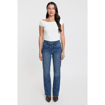 HIGH RISE DISTRESSED HEM CROP STRAIGHT JEANS COMFORT STRETCH DENIM, HIGH RISE WAIST, DISTRESSED DETAIL, CROPPED LENGTH, STRAIGHT JEANS F. RISE: 10" / INSEAM: 27" / LEG OPENING: 16" MODEL IS 5'10" WEARING A SIZE 26