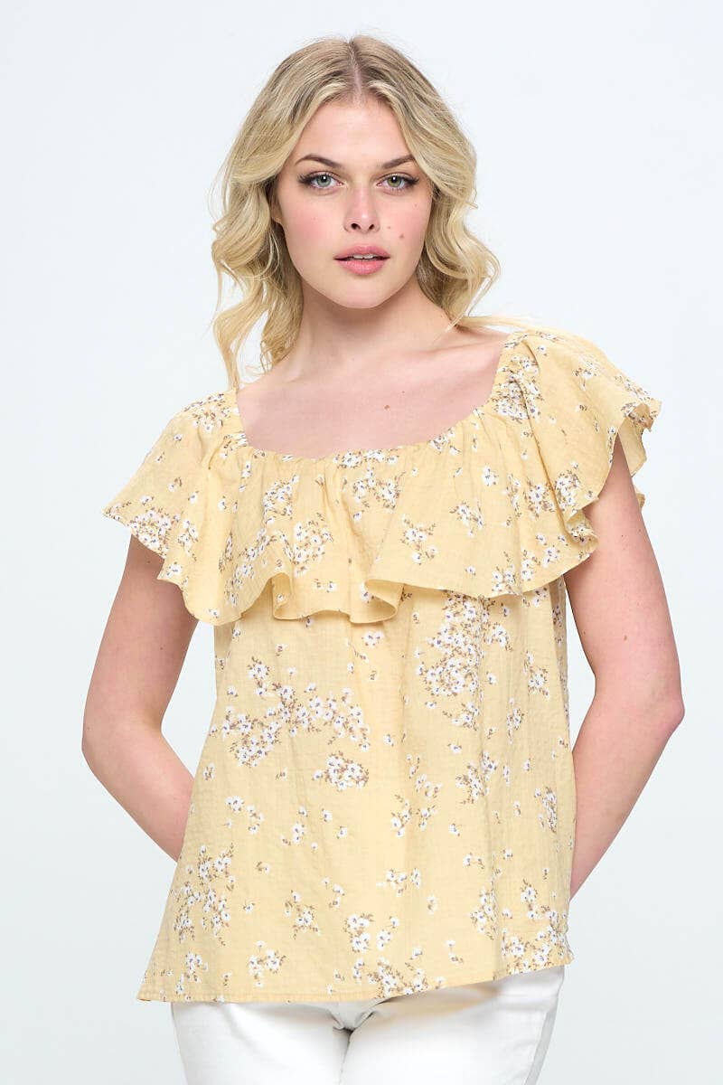 TB8637 2 SMALL 2 MEDIUM 2 LARGE V NECKLINE SCALLOP NECKLINE DETAIL SHORT TULIP SLEEVE FLORAL PRINT SATIN TEXTURE BLOUSE NOT LINED 97%POLYESTER, 3% SPANDEX
