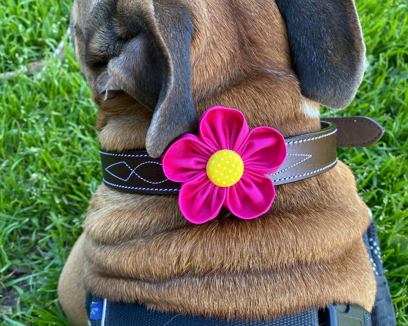 A red poppy collar flower to make your pet extra precious! Size XS measures approximately 1.75" in diameter. This size is available as a set of 2 flowers per package - not available individually. Size small (shown on dog model) measures approximately 2.5" in diameter. Size large measures approximately 3.5" in diameter. All sizes feature one hook and loop strip to attach around a collar. Hook and loop fastener is left extra long (4" for size large, 3" for size small, 2" for size XS) to allow room to be trimmed for a perfect fit. This collar flower accessory is a handmade item, sewn and then reinforced with glue. All measurements are approximate. Supervise your pet while wearing and do not allow to chew. Collar is not included.
