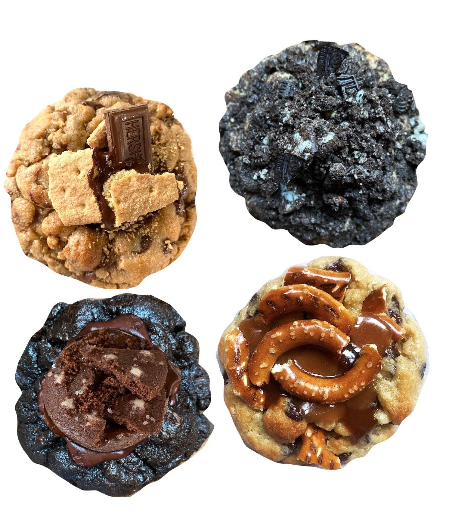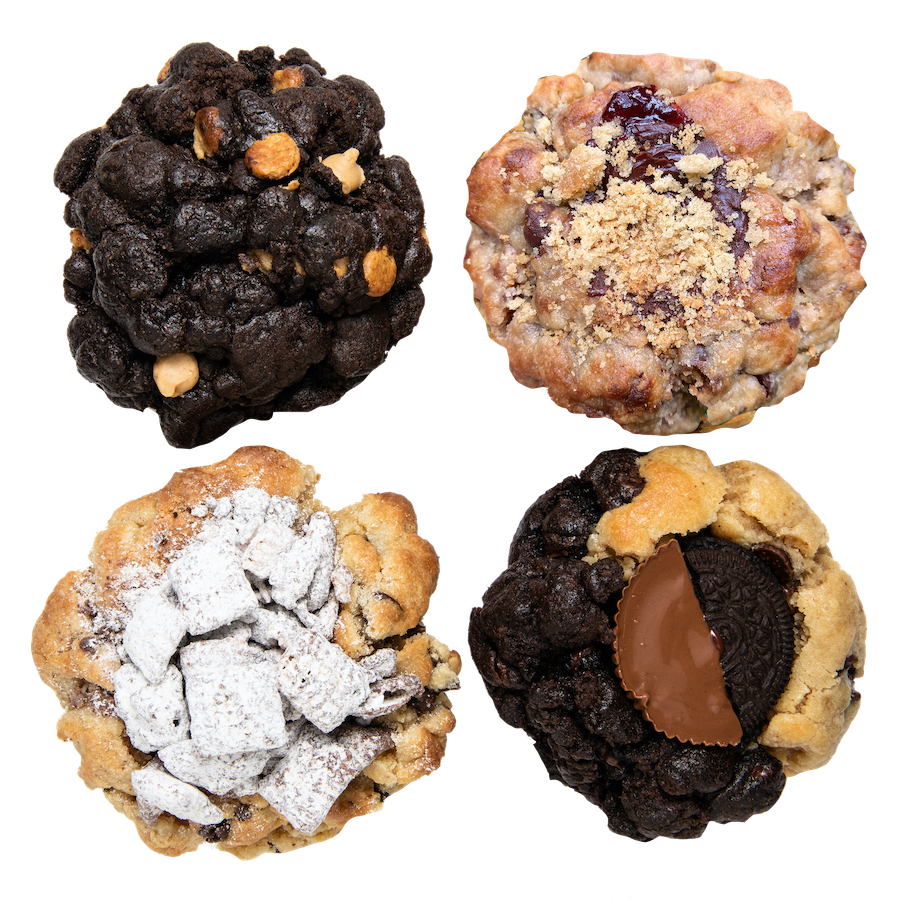 Party Harder: It's got all the fixins' for a PARTAYYY!! Sprinkles and more sprinkles, housemade rice crispy, Nutella, M&M's and more sprinkles! Brown butter chocolate chip base filled with Oreos, rainbow sprinkles, semi sweet chocolate chips & rainbow M&M's brown butter cookie base + house made fudge on back with custom rainbow sprinkle mix Classic & Oreo chocolate chip cookie base with a sprinkle surprise & fudge sealer with a big Oreo Quadruple chocolate & peanutbutter cookie base with Nutella and a homemade rainbow rice crispy