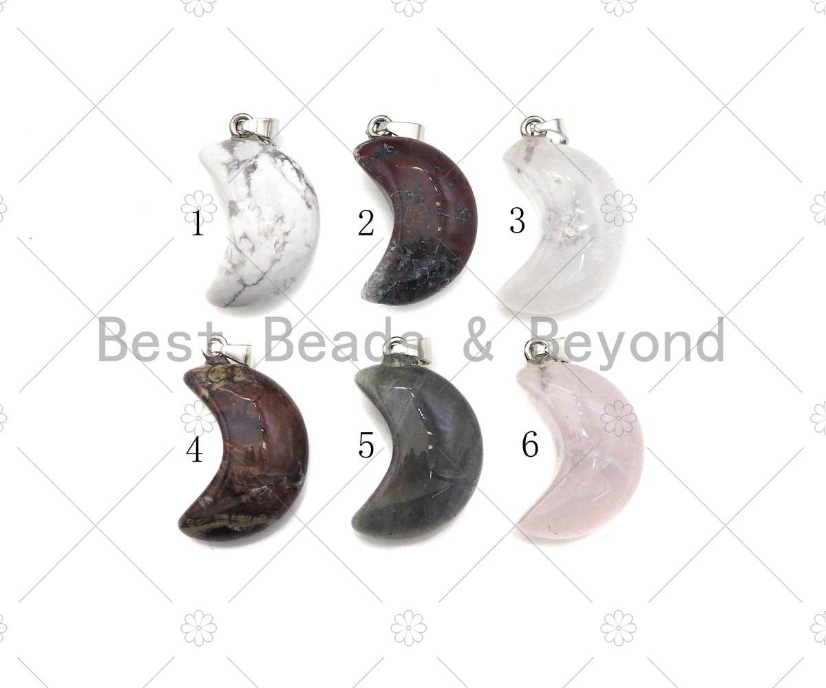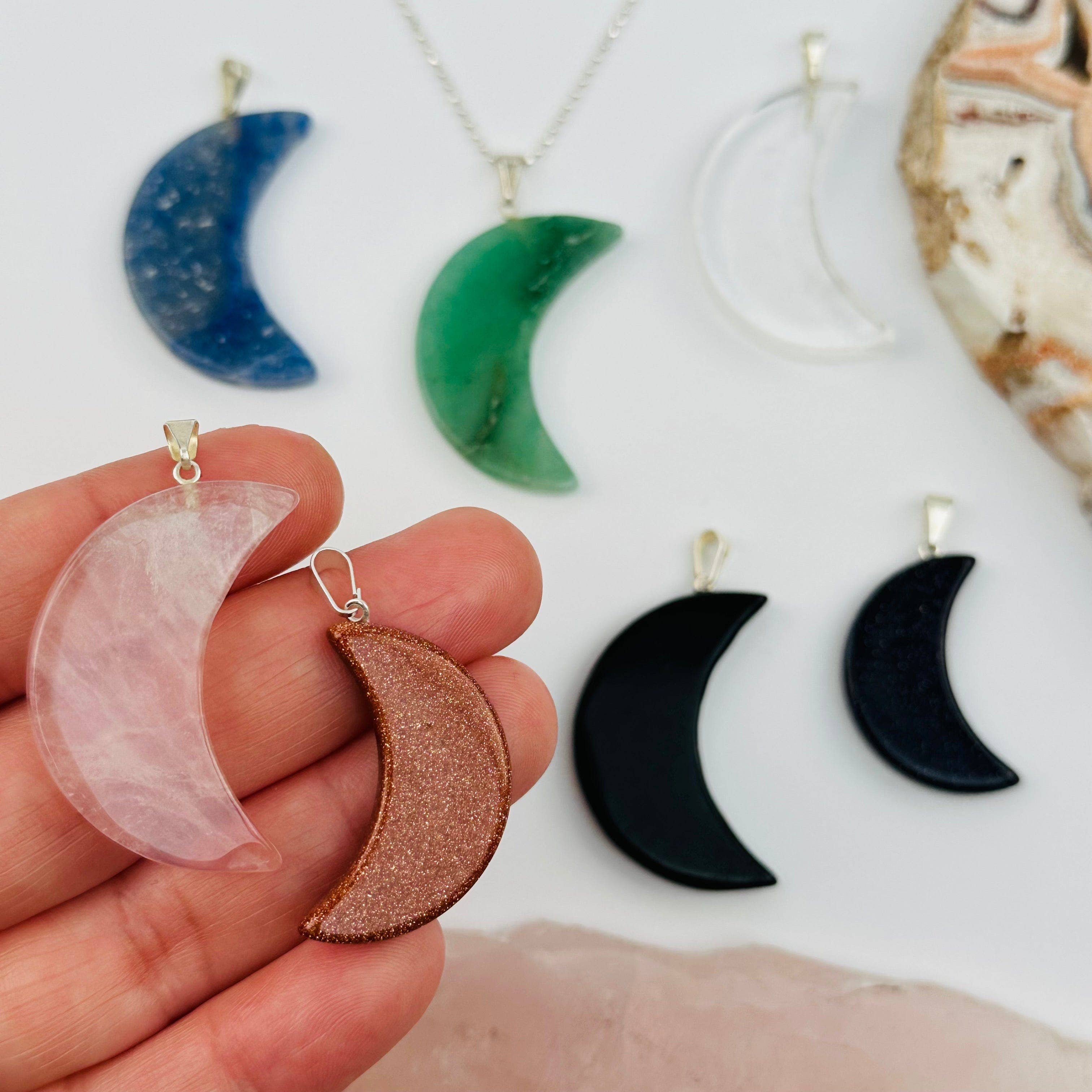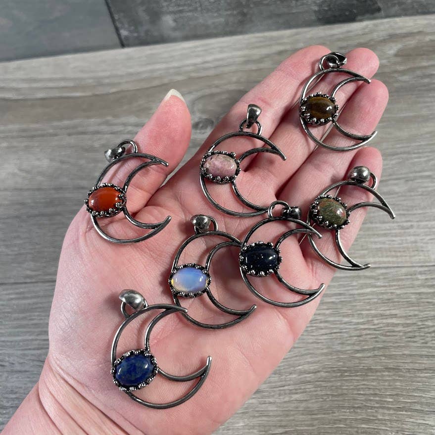 Natural Gemstone Half Moon Pendant Necklaces Gemstone:- Golden Healer, Green Aventurine, Amethyst, Tiger Eye, Hematite, Pyrite, mookaite, Fluorite Length:- 1.13 Inches Handmade Made In India