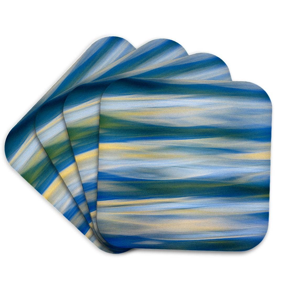 Our abstract ocean watercolor ceramic coasters are the perfect accent to your table and the cork backing adds to the coastal vibes. Approx. 4” Square or Round Sublimation Printed Glossy Ceramic with Cork Back