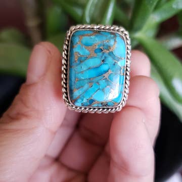 Very-Big! 2.6" Long, Gemstone, Brass Dual Adjustable Ring * Adjustable by expanding only both bands, not turquoise * Natural stone may vary in size, color or shape * One size, Adjustable by pull/push brass dual band * Big! 2.6" gemstone on alloy metal, antique silver plate * 20 grams weight * Nickel, Lead & Chrome free