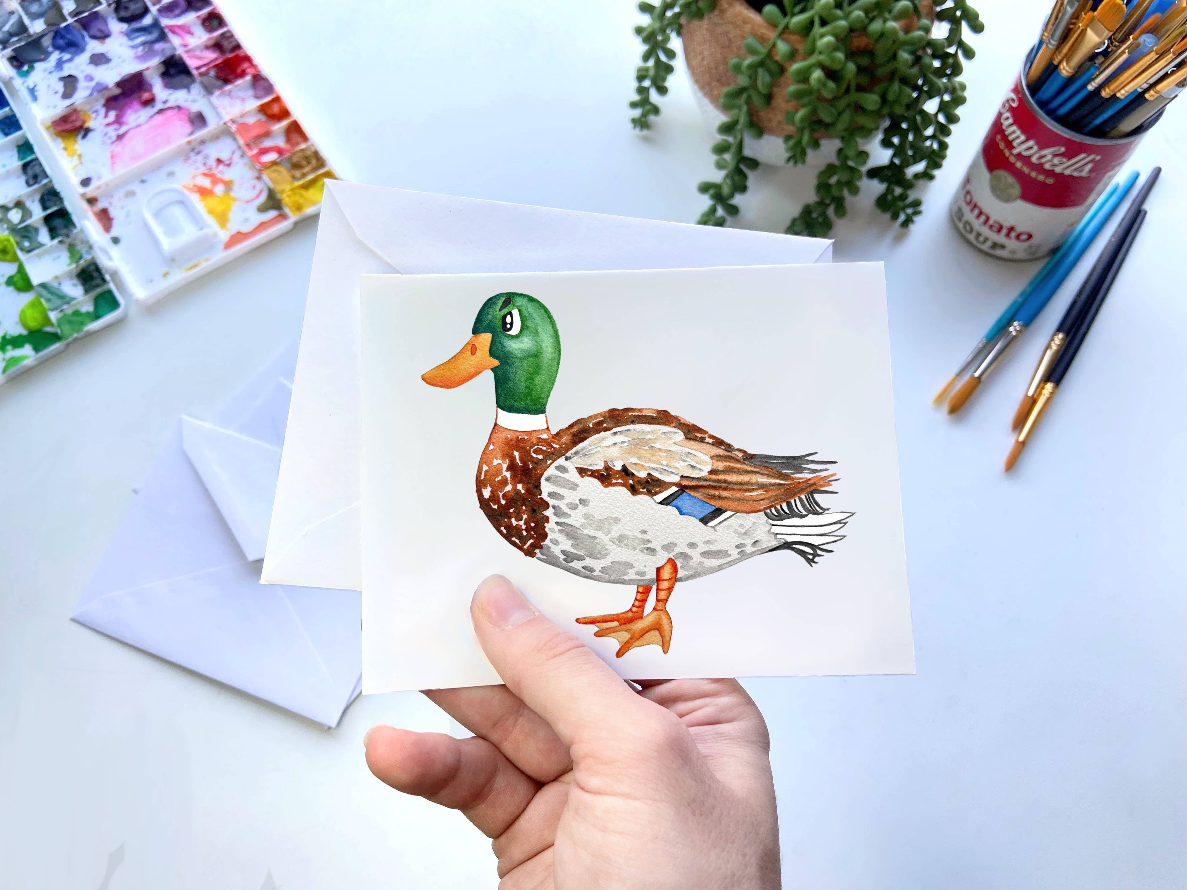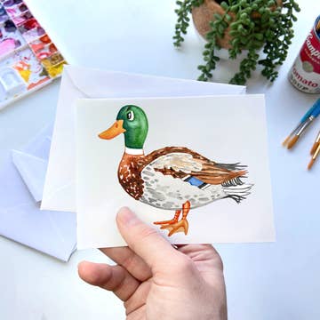 A matte photo card featuring raindrops on a mallard duck in Portland, OR Features: • All photos were taken by Honeycomb • Measures 4.25 x 5.5 inches (A2) • Cards are printed on FSC Certified paper • Each card comes with a Post Consumer Waste Kraft envelope • Blank inside • Matte finish