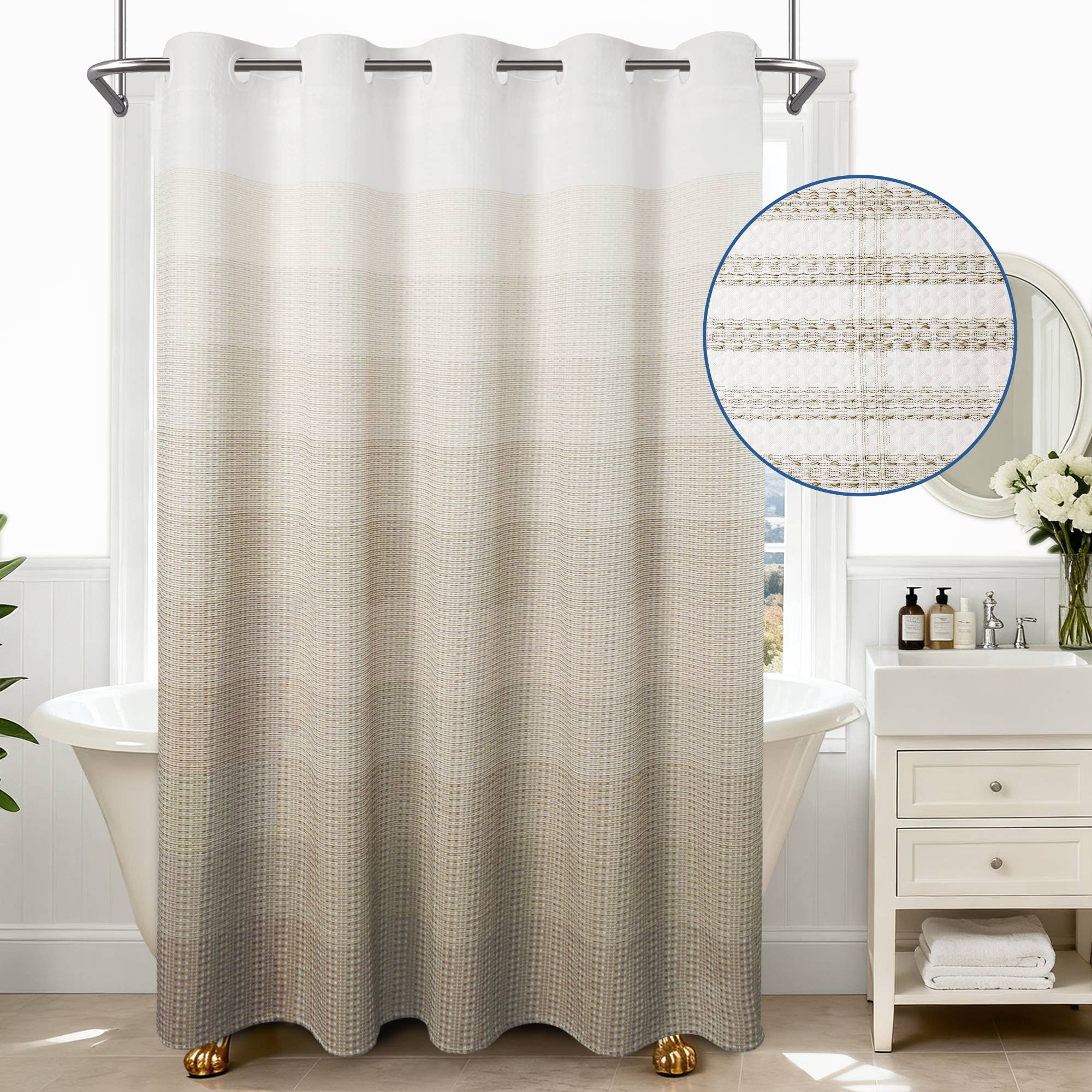 Pom Pom Embroider Fabric Shower Curtain Liner - 70"W X 72"L - White & Grey Machine Washable and Dryable for easy care. No shrinkage, No color fading, and No unravelling after washing