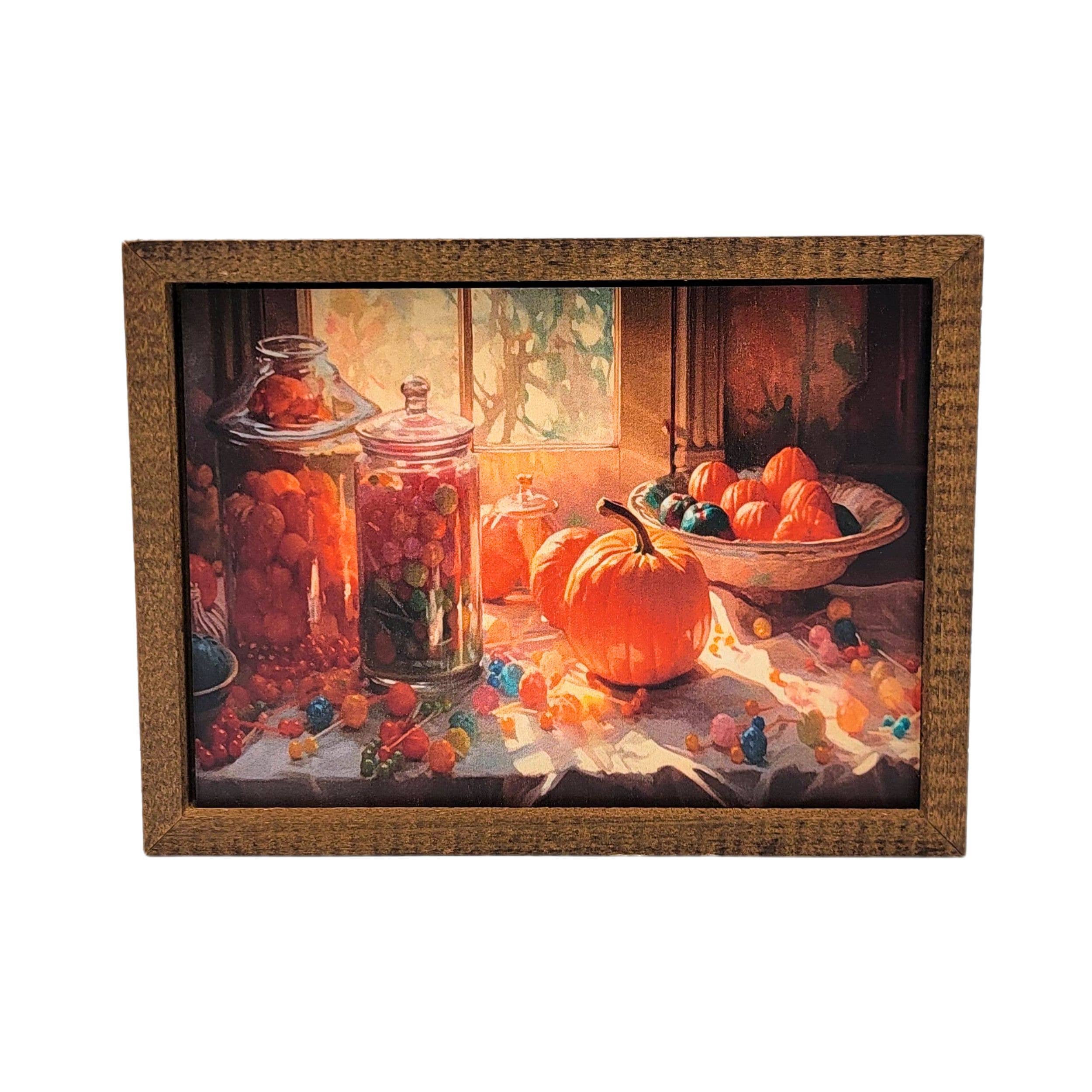 Introducing a whimsical masterpiece that captures the essence of autumn's charm! Surprise a friend or family member with this heartfelt and artful present for housewarmings or any occasion that warrants a touch of autumn-inspired delight. • Printed with vivid colored inks on cotton canvas mounted on wood • Solid hardwood frame in shown stain colors • Sustainable American oak or alder wood • Made in the USA in our Utah studio • MINI 6" tall x 6" wide x 1.25" deep w/ 1/4" thick frame • SMALL 11" tall x 11" wide x 1.25" deep w/ 1/4" thick frame • MEDIUM 15" tall x 15" tall x 1.5" deep w/ 3/4" thick frame • LARGE 22" tall x 22" tall x 1.5" deep w/ 3/4" thick frame • Signs may have +/-1" variations • All signs can stand on a shelf or table (Medium & Large can also hang on a wall) • Farmhouse style frames have small rustic imperfections that make them unique