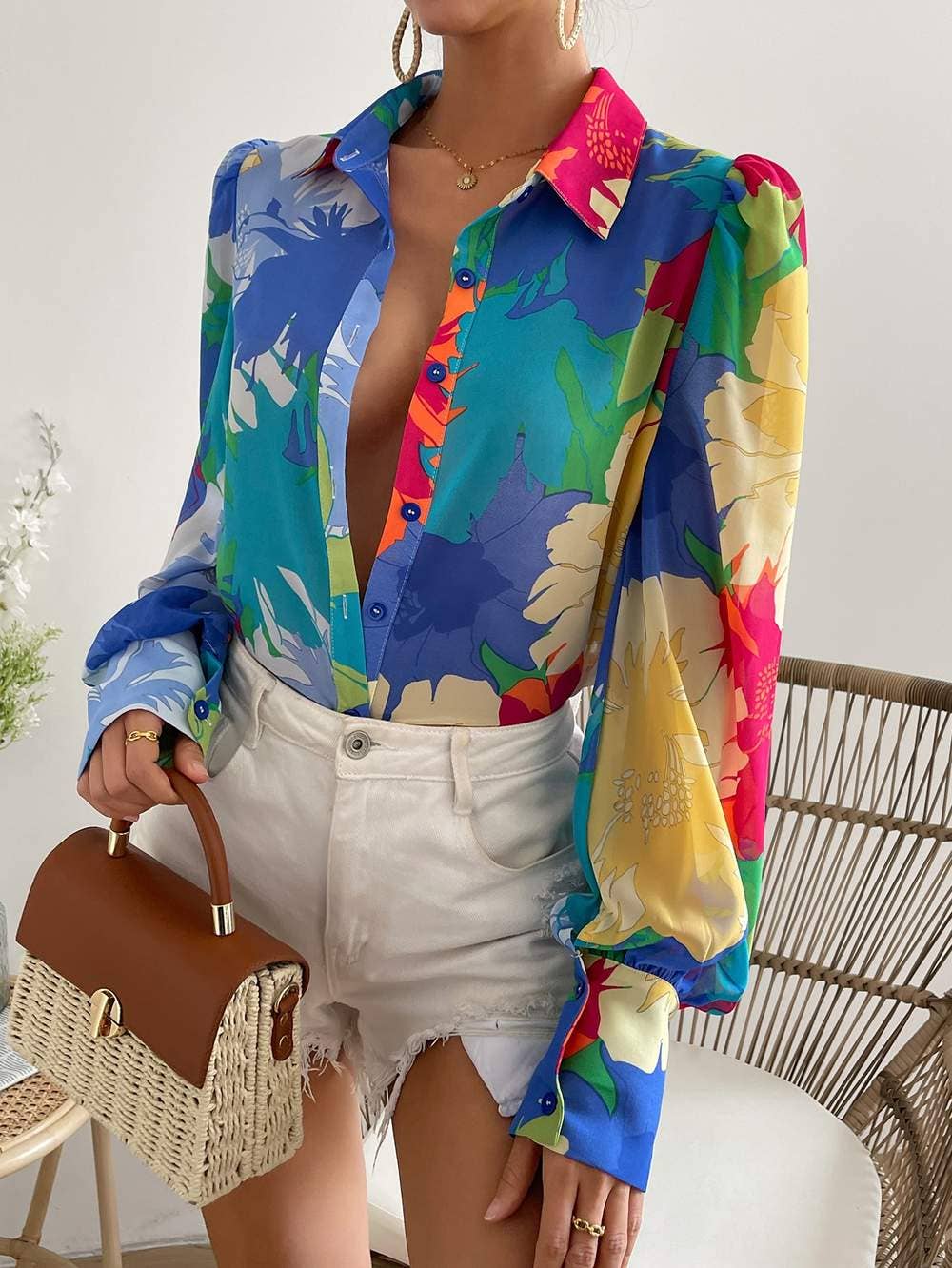 long sleeve button down shirt, collared fashion blouse, ruffle roses flower sleeves.