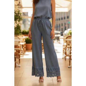 Embroidered pants with drawstring and 2 pockets in cotton linen. Elastic waistband with drawstring for easy adjustment. Wide and fluid silhouette offering a loose and relaxed fit. The hem is adorned with openwork embroidery that adds a delicate touch. These pants suit a casual chic or summer relaxation style.