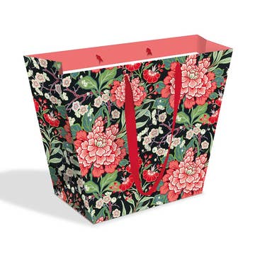 Size: 13” tall x 9.5” wide x 4.5” deep. This stylish holiday design features an "all over" illustration of pink poinsettias, pine cones, paper whites, and holly, adding a festive sparkle to your Christmas gift bags collection. These floral gift bags come with high-quality handles made of matching pink grosgrain ribbon fitted through metal eyelets. Special touch: Inside back lip has the quote, “May your days be merry and bright” in white script. These large gift bags are designed and manufactured in California, using sustainably sourced, heavyweight paper with a scuff-proof finish - ensuring luxury and durability. Matching 9” handles made of grosgrain ribbon, fitted through metal eyelets ensure ease of carrying. Cardboard is inside the bottom for added strength. A clear plastic hanging loop is included with each bag, but is unattached. Package: Loose Ideal for retailers looking to offer unique Christmas bags, this collection epitomizes holiday cheer with a touch of luxury.