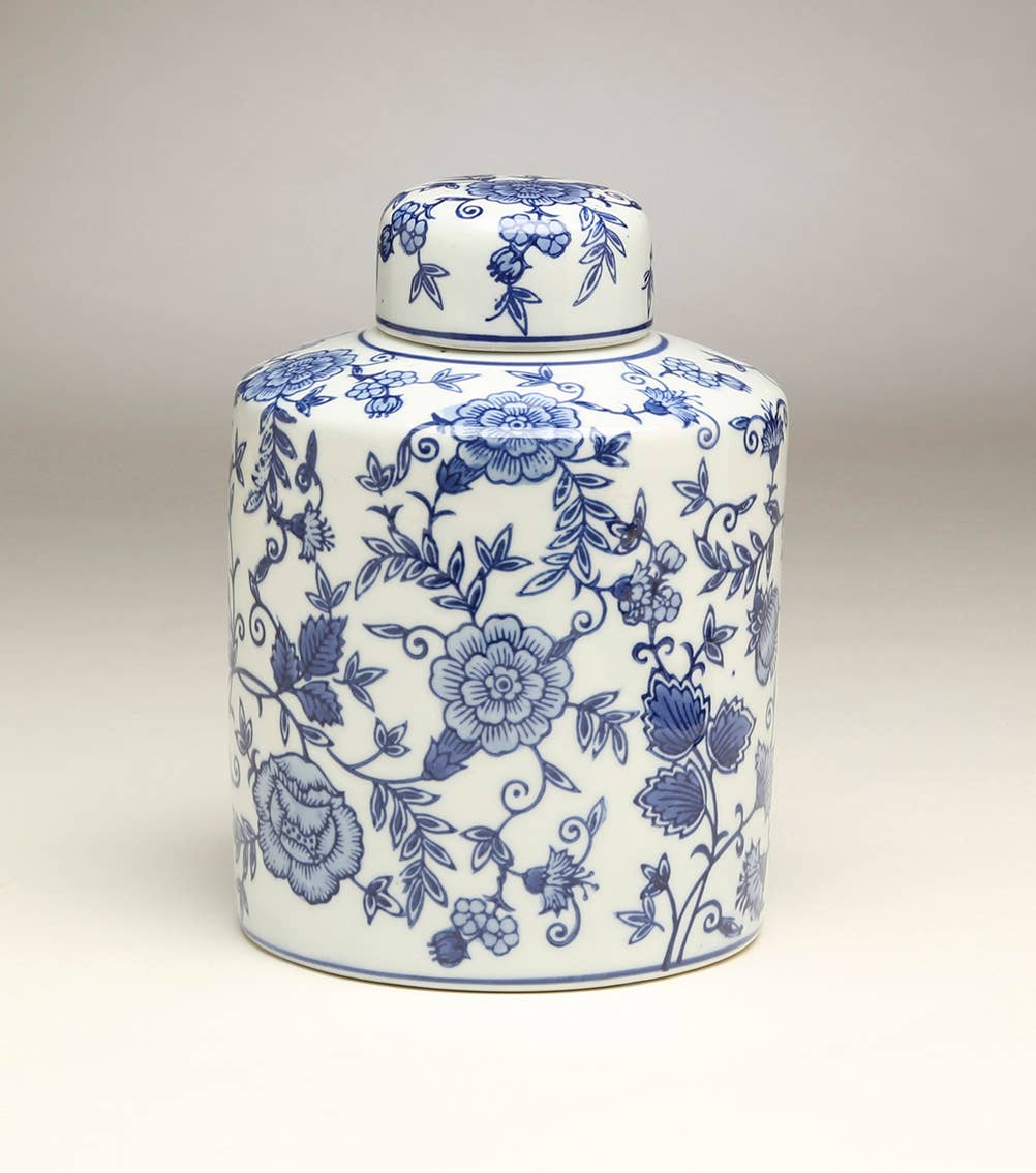 Our best-selling ginger jars just got a Chinoiserie makeover! These decor staples are hand-painted by a talented Lo Home artist with our new favorite motif composed of winding Chinoiserie -inspired botanicals. Each piece is a unique work of art which will add an elegant touch of color and pattern to any area of your home or event! Our classic swallow-tail lidded jars are hand-poured in Oklahoma/ Pennsylvania and hand-painted by a Lo Home artist before being fired for a beautiful and durable finish which is food and water safe. Dimensions: Small: 5" W x 5" D x 8" H Medium: 6.75" W x 6.75" D x 13.5" H Large: 8.5" W x 8.5" D x 16.5" H