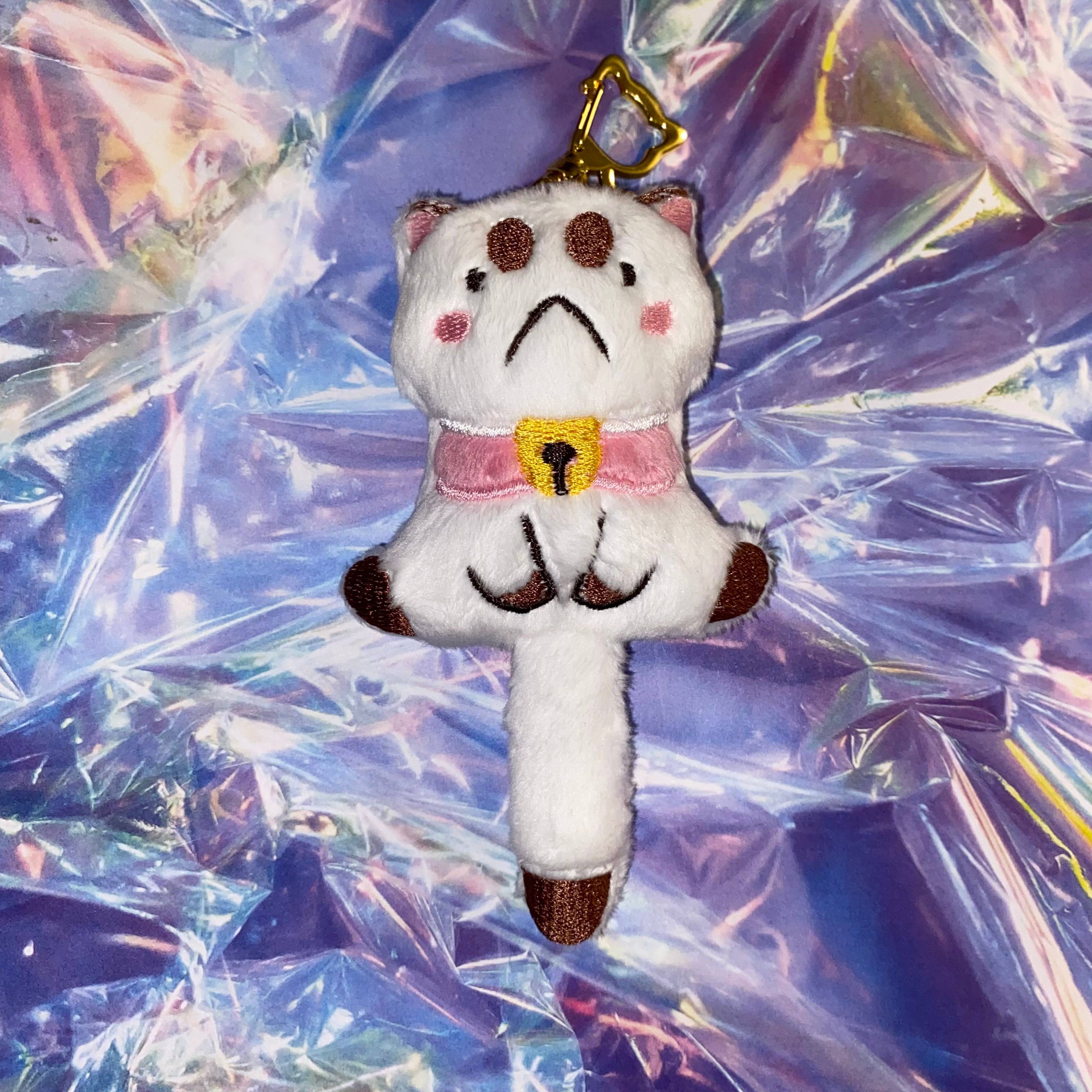 Super cute and soft Black Cat Meme plush keychain! Made from soft minky with embroidered details. Stuffed with poly-fil fiber fill.