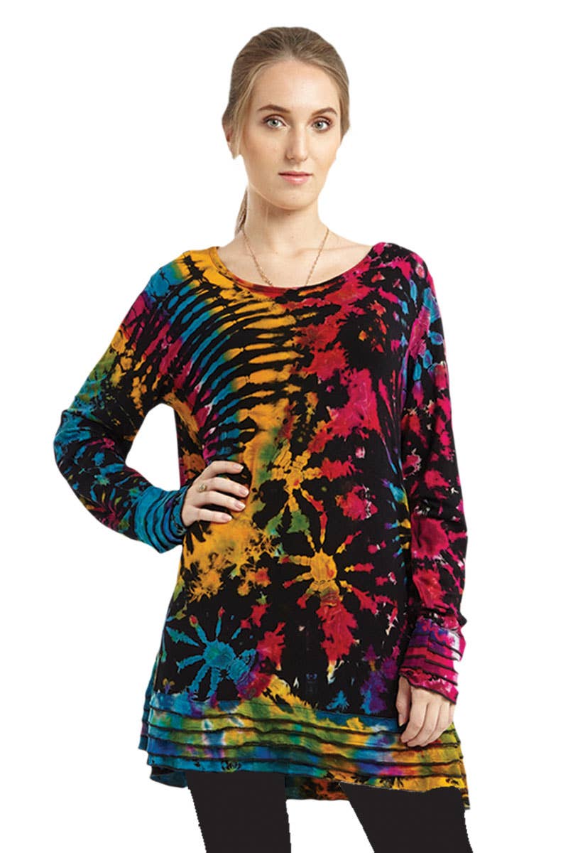 Bring color and coziness to your styles with this rayon sleeveless top that bears a vibrant tie-dye and add an exciting pop of print into everyday looks.
