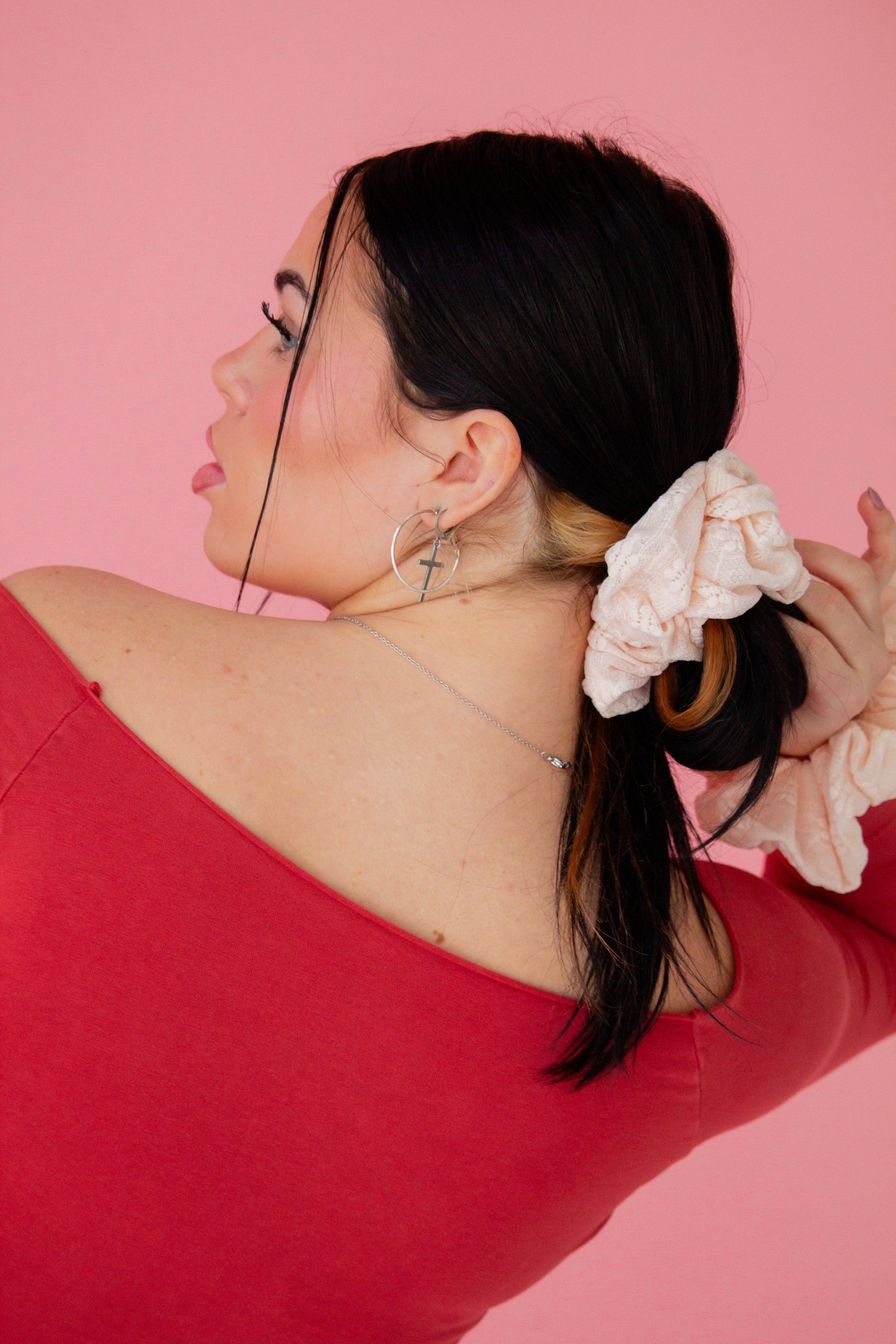 Soft velvet. Calm energy. The Plush Velvet Scrunchie in Pink Cloud is feminine, dreamy, and effortlessly comforting. With its cloud-soft texture and gentle pink hue, it brings a quiet luxury feel to your everyday routine. Smooth, stretchy, and no-pull, it glides through your hair and holds comfortably without tugging. It’s the kind of softness you reach for on purpose—cozy, romantic, and easy to wear from morning to night. • Polyester microvelvet • Handmade in California
