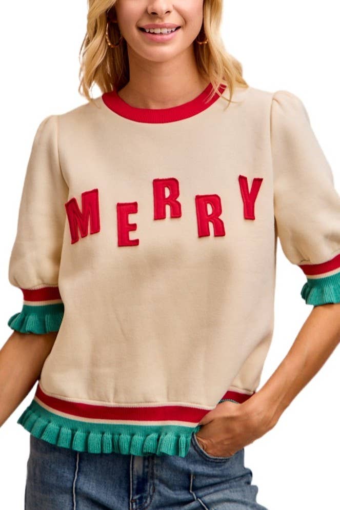 - SOLID URBAN RIBBED TOP - LONG PUFF SLEEVE - ROUND NECKLINE - BE MERRY LETTERING DETAIL MODEL SIZE: HEIGHT 5'6", BUST 32", WAIST 24", HIPS 32" WEARING SIZE: SMALL *The garment color may differ slightly upon arrival due to being taken with professional lighting also depending on what device you may be using to shop*