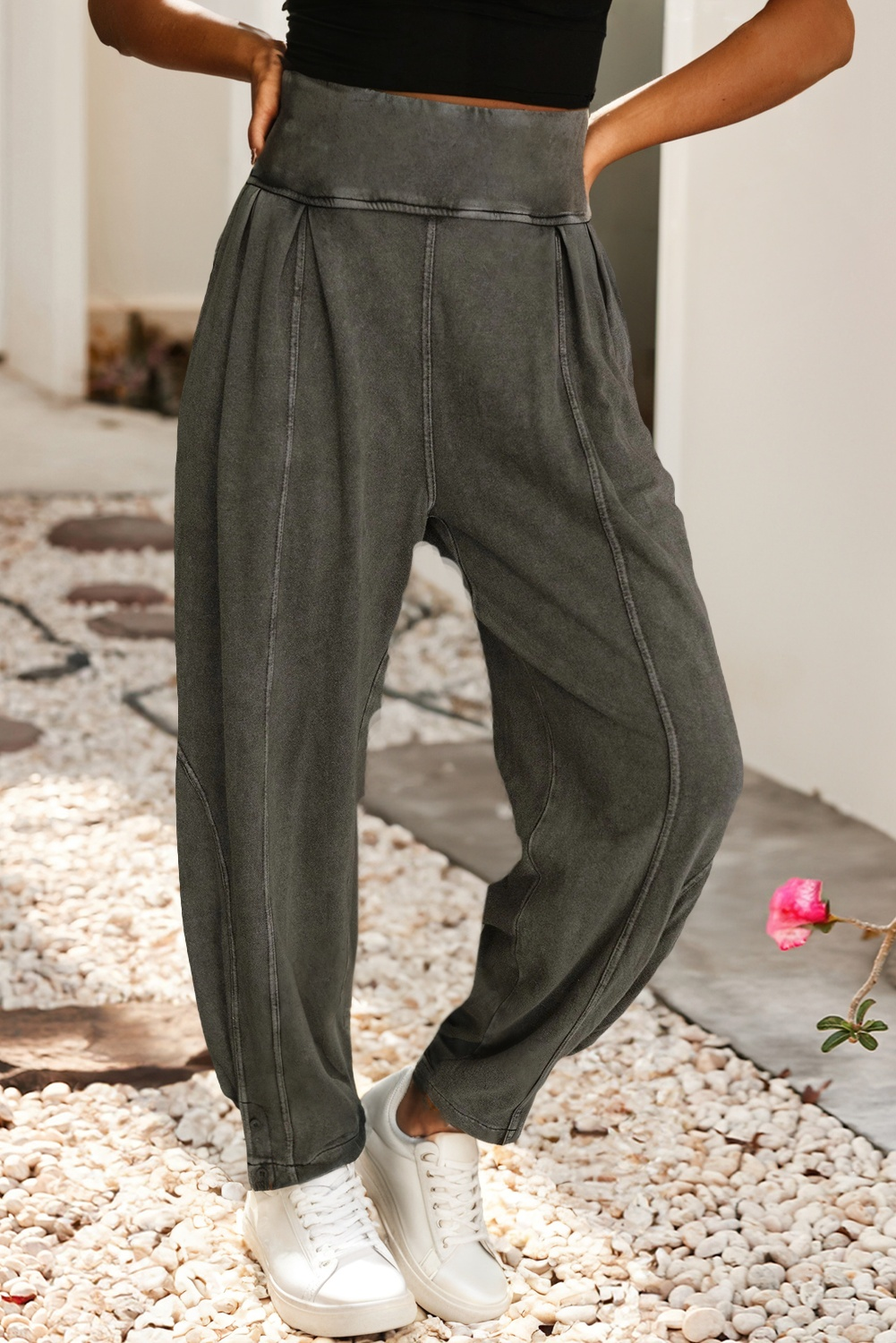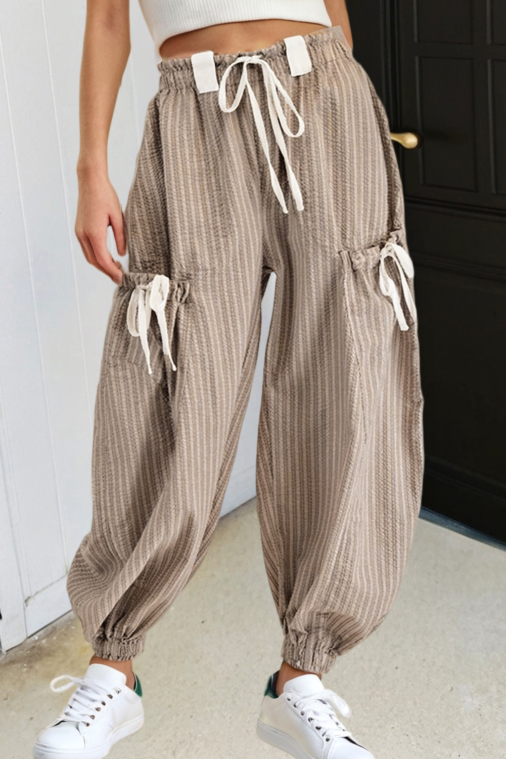 RHINESTONE ELASTIC WAISTBAND POCKETS LONG JOGGER PANTS Model is wearing Small Height: 5'9" Bust: 32B Waist: 24" Hips: 34"