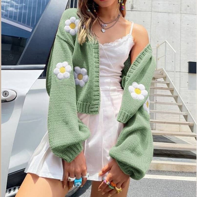 A cozy knit cardigan featuring charming 3D flower accents and decorative buttons. Its relaxed fit and unique design make it perfect for both layering or wearing on its own. A lovely piece that adds a playful and stylish touch to your everyday outfits. FlowerCardigan 3DKnit CuteCardigan StatementKnitwear DailyLook
