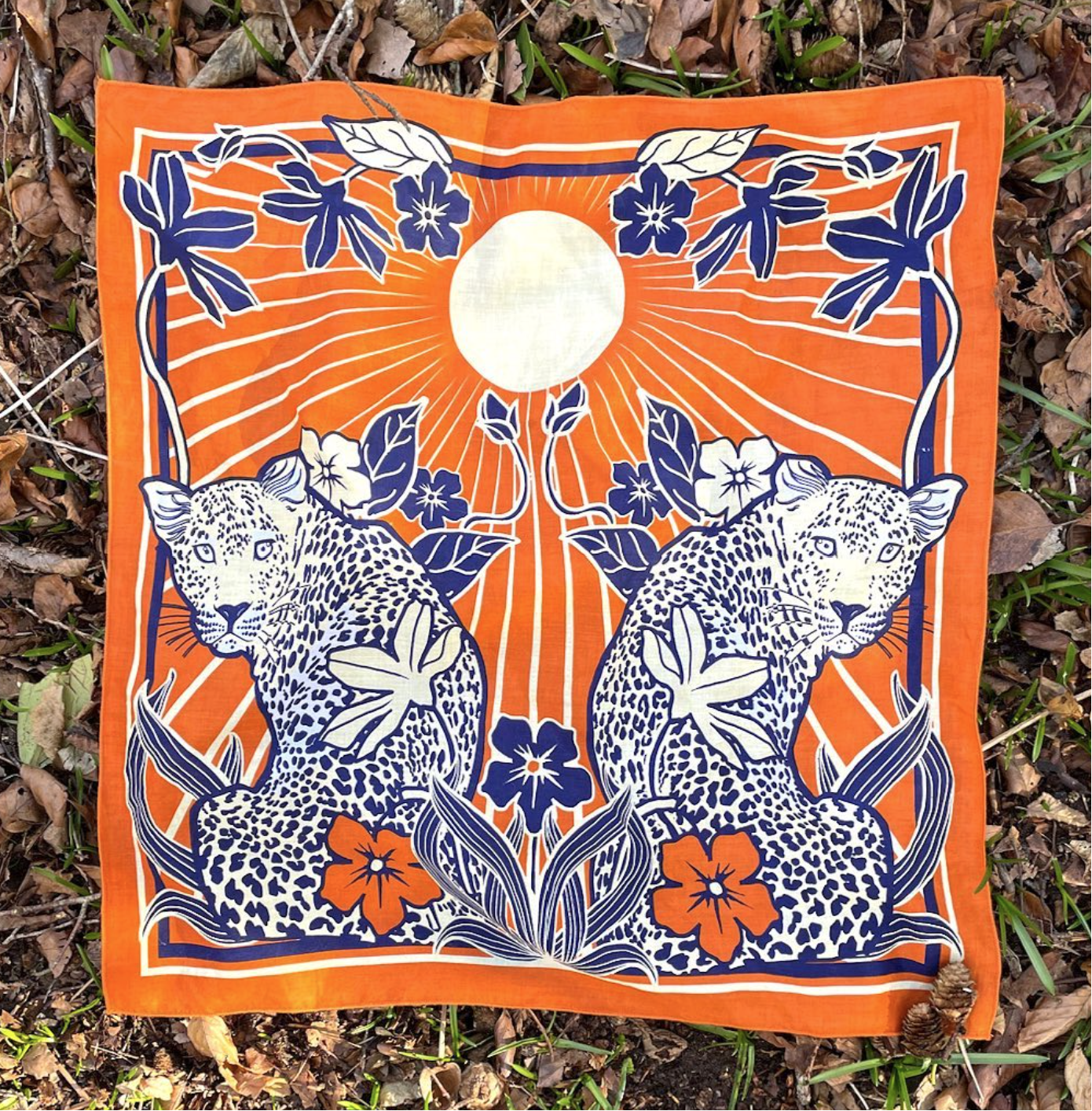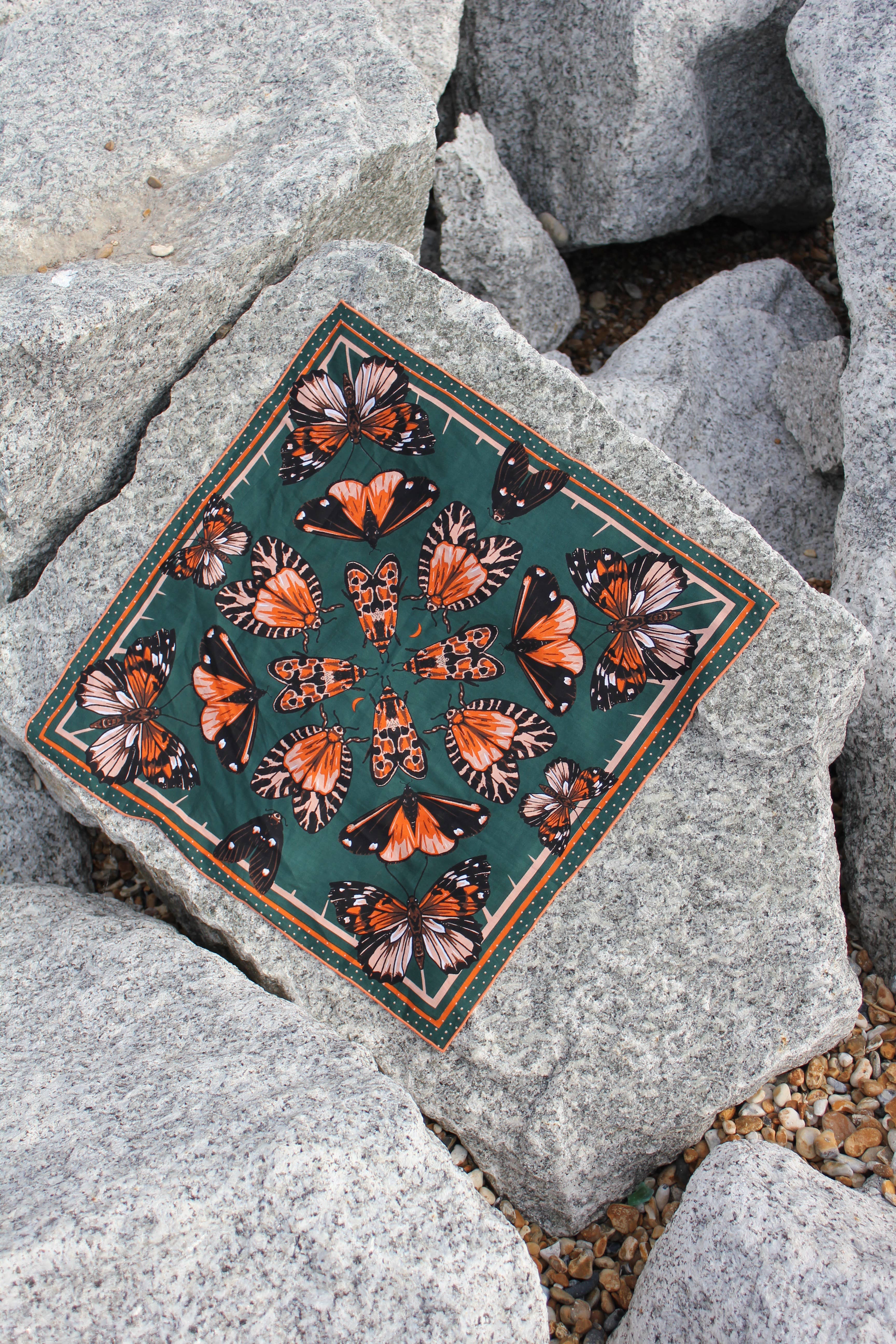 All scarves only use natural pigments and are screen printed on 100% organic cotton, sourced and produced with fair trade partners and all materials are certified by the Global Organic Textile Standard. Size: 21" x 21" with hemlock stitched edging.