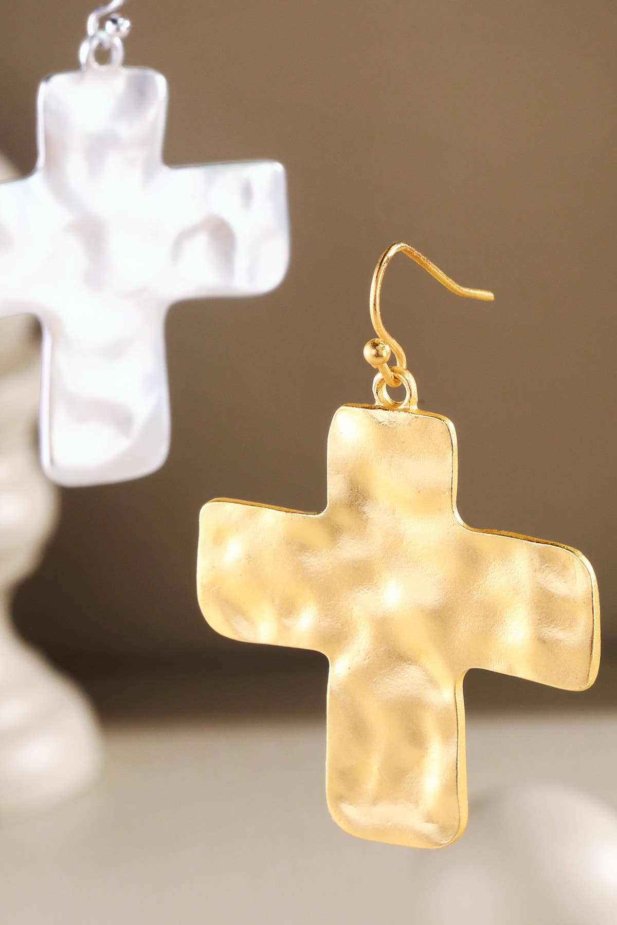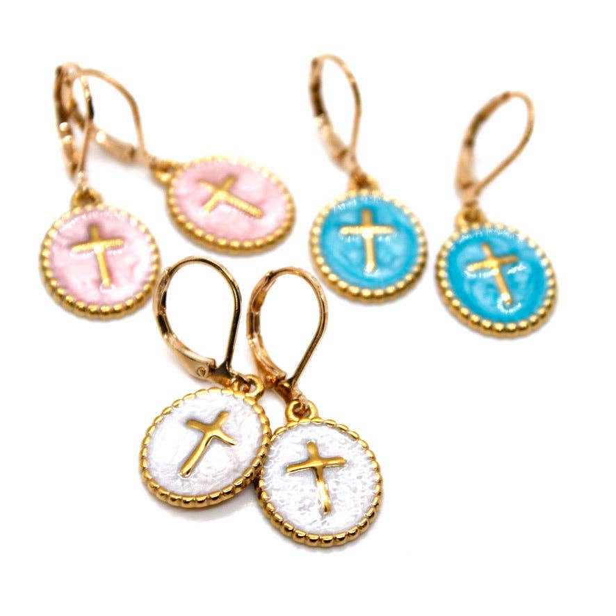 Small marble pearl cross dangling from gold hoop Length: 2" from top of hoop to bottom of cross Pairs perfectly with the Pria Bracelet and Pria Necklace!