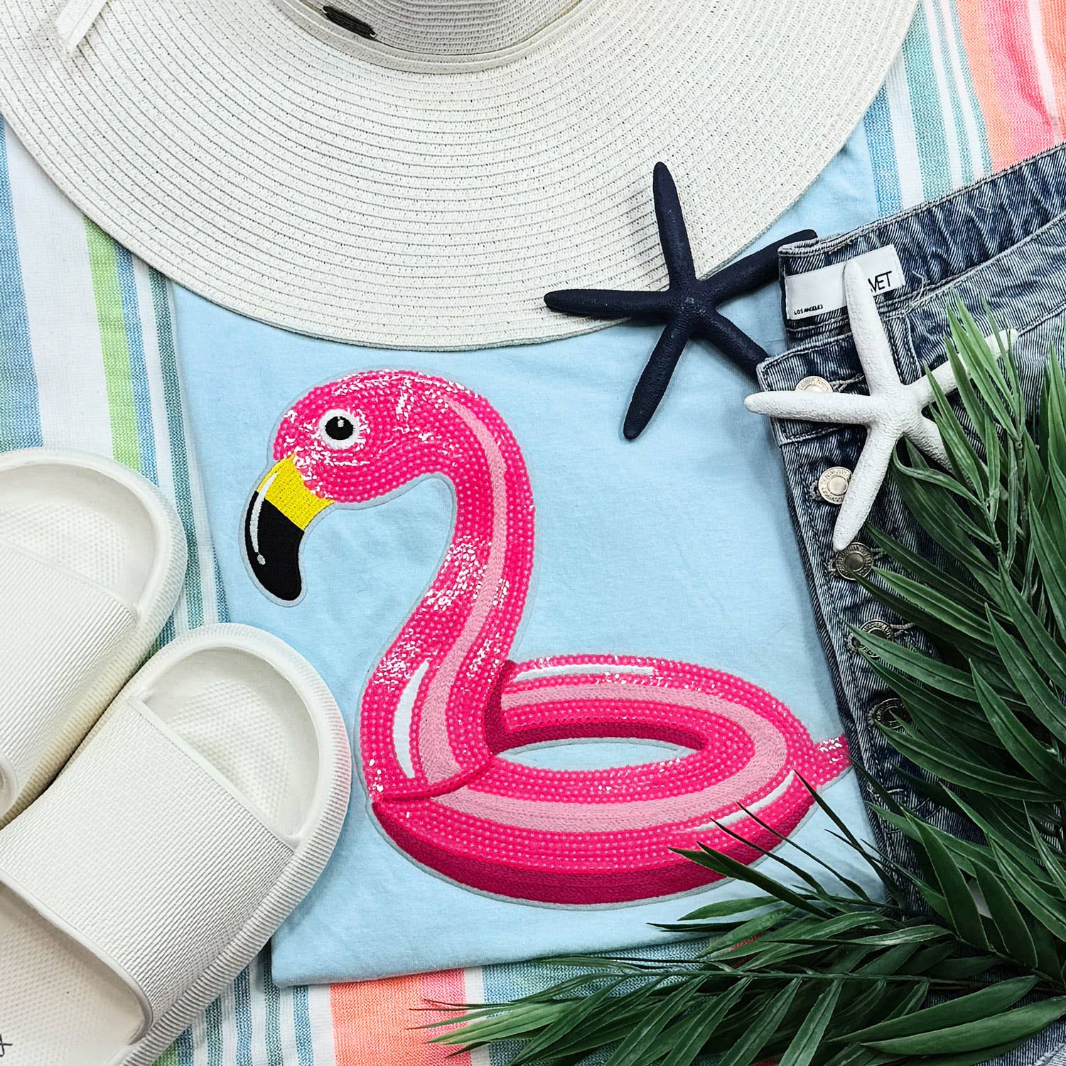 Wholesale Flamingo Hello Summer T-Shirt, Retro Tee with Tropical Birds
