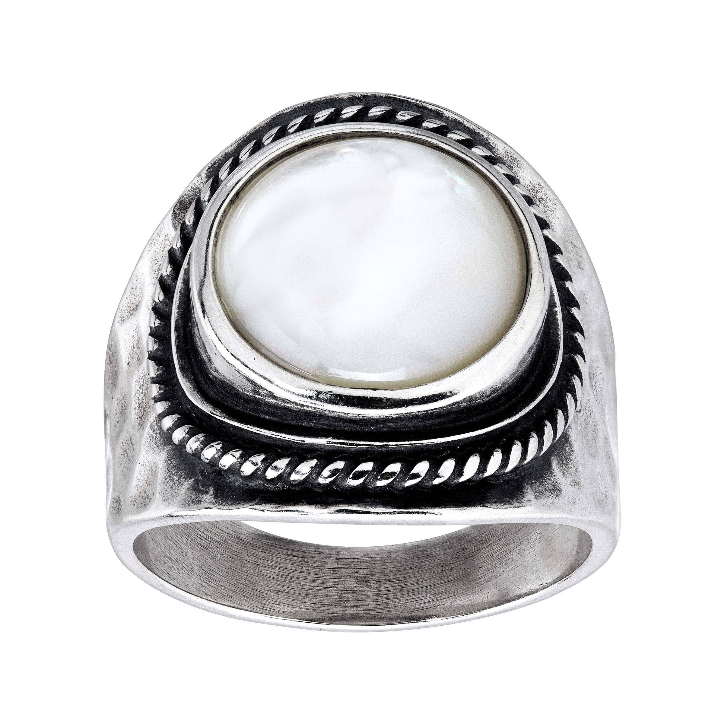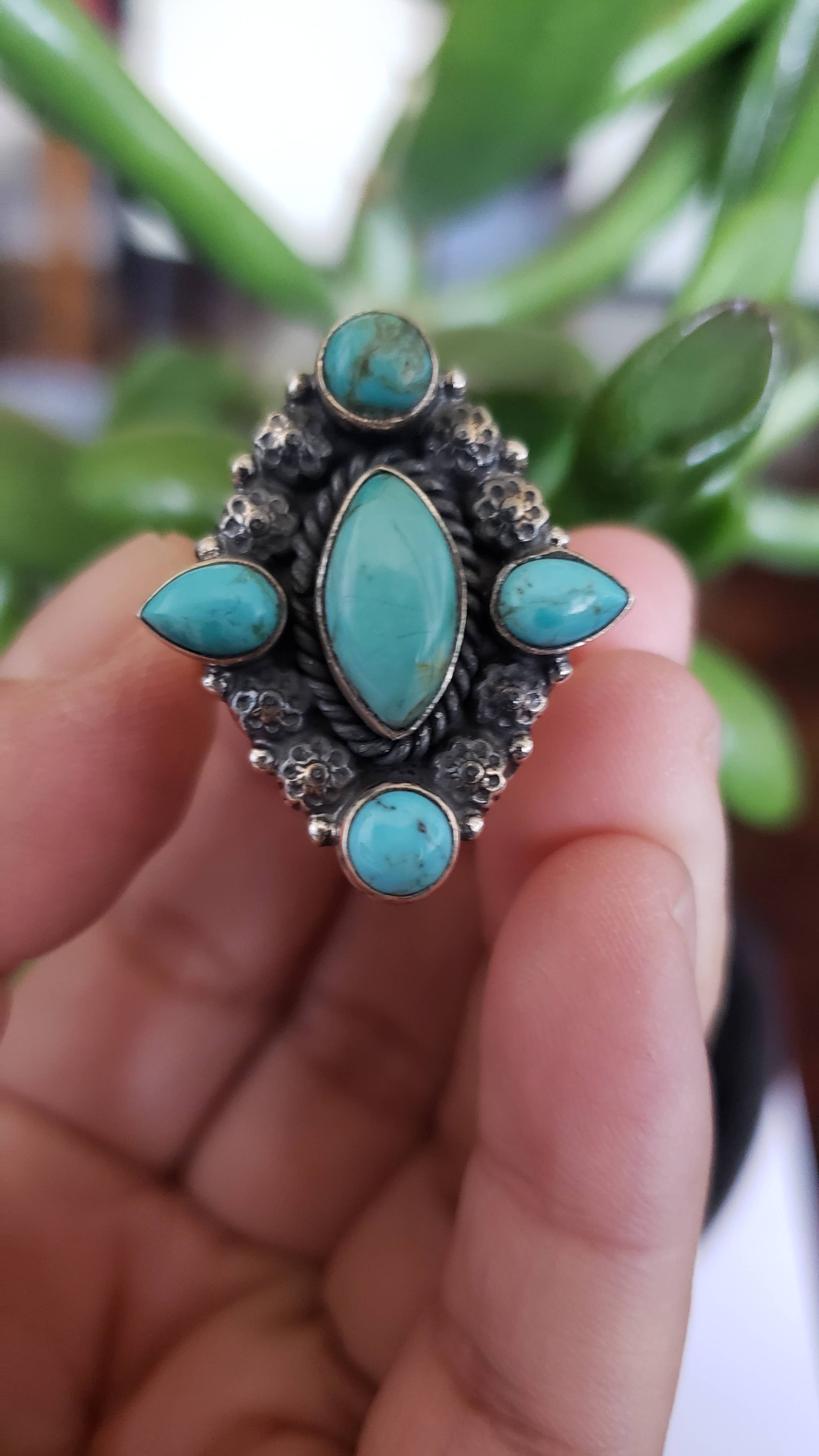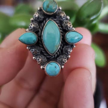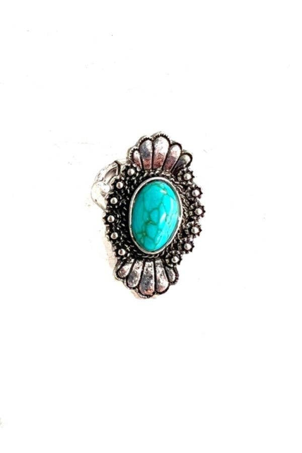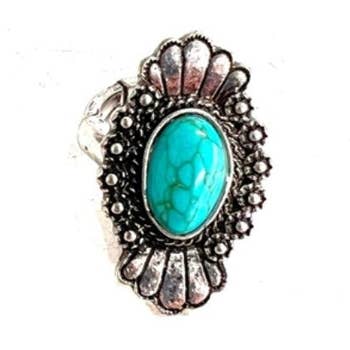 1.5" Long, Navajo White Turquoise Ring, Brass Dual Adjustable Band * Adjustable by expanding only both bands, not white turquoise * Natural stone varies in size, color, or shape * One size, Adjustable by pull/push brass dual band * 1.5" on alloy metal, antique silver plate * 8 grams weight * Nickel, Lead & Chrome free