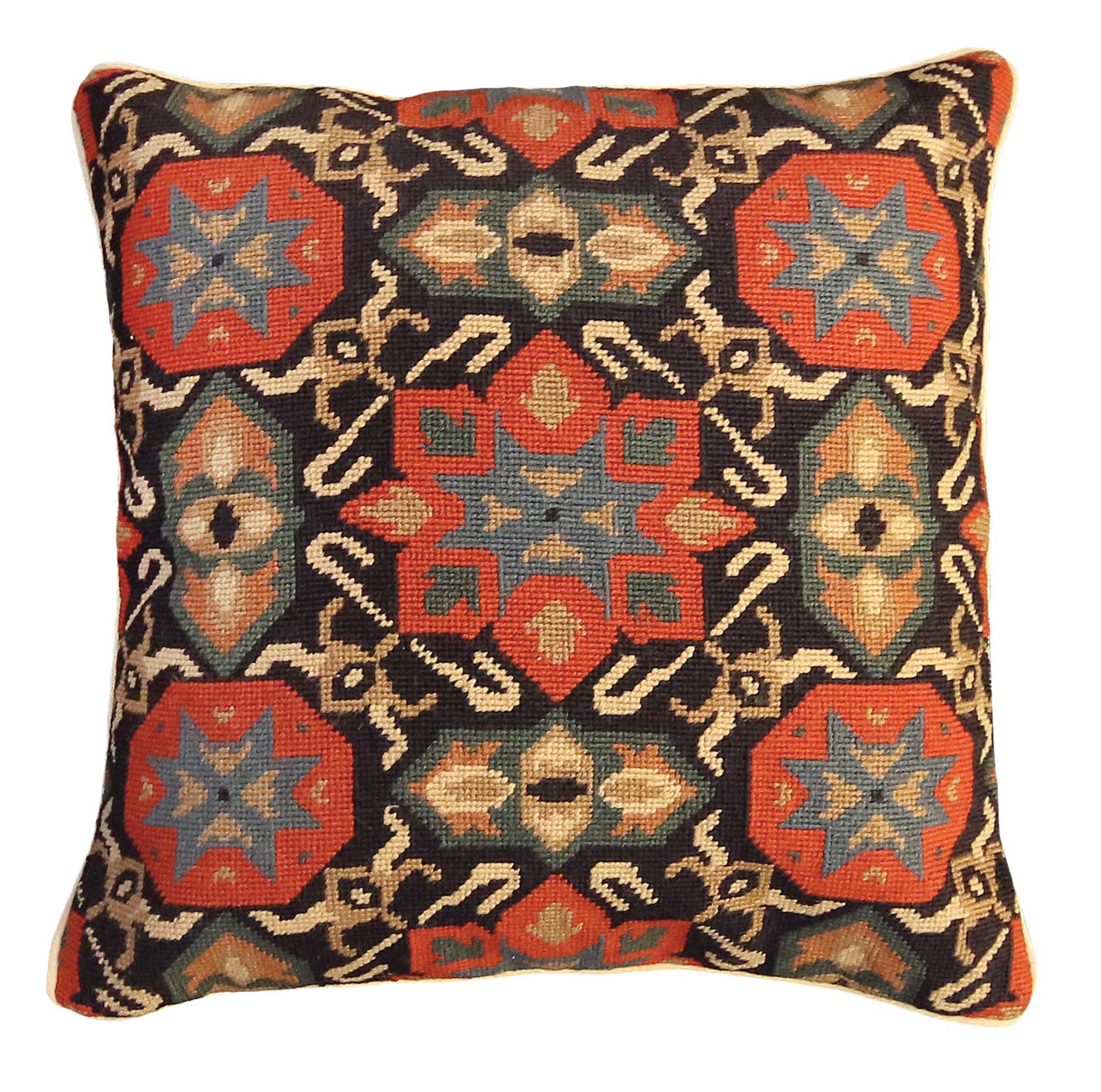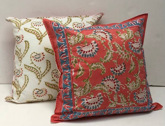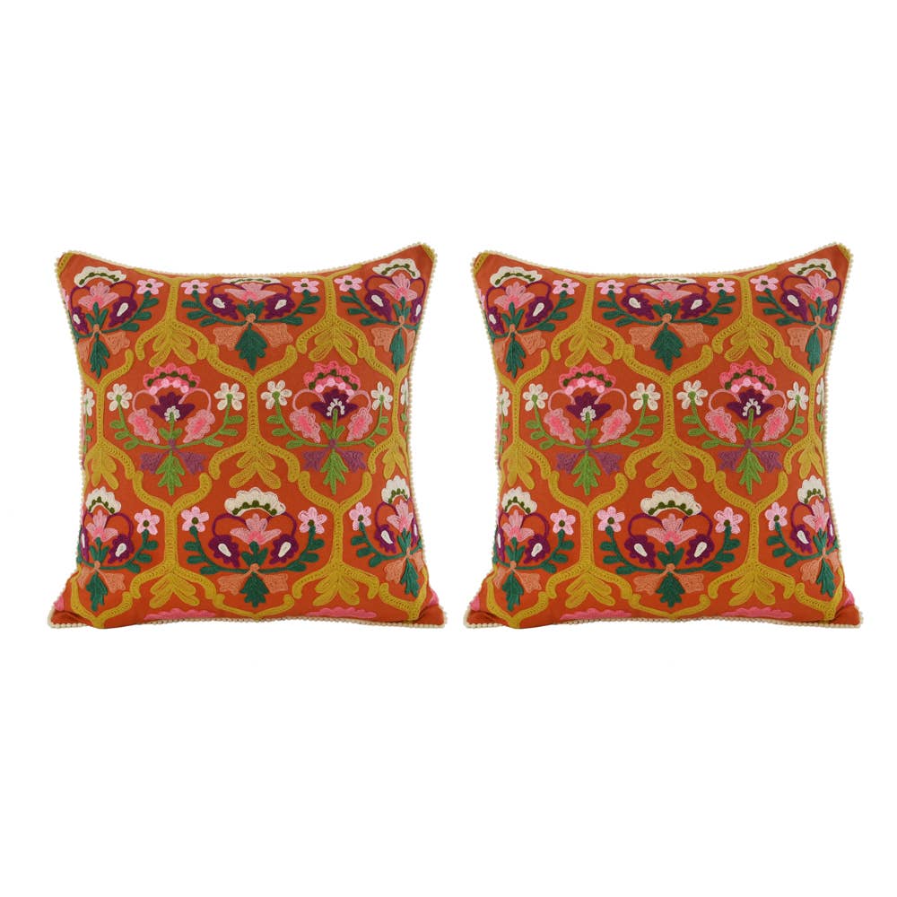 This pillow is inspired by a textile from Uzbekistan, handmade in the traditional suzani embroidery technique and consists of delicate silk embroidery on a silk-cotton blend backing. Suzani, which is embroidered with a tambour hook, is a classic Central Asian textile characterized by flowers and meandering vines. A specialist known as a chizmachi draws out the suzani pattern, then each fabric strip is given to an embroiderer, and finally the finished pieces are sewn back together. The result is a grand work created by several hands, producing charming irregularities and subtle mismatches that balance out the precision of the stitch. The flower designs seen here are symbolic of fertility and fruitfulness.