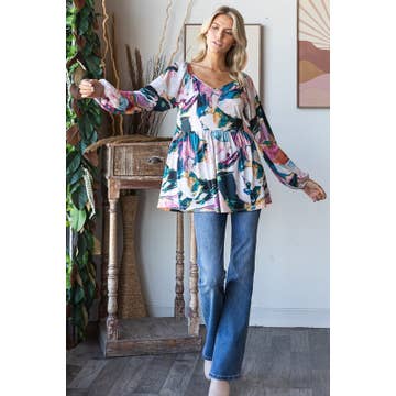 Boho multi-print floral patchwork tiered tunic top in soft viscose/rayon, featuring a relaxed A-line silhouette, vibrant mixed prints, and breezy everyday comfort. • Style: Boho multi-print patchwork floral tiered tunic top • Material: Soft, breathable viscose/rayon • Embroidery: None • Design: Mixed floral patchwork, tiered A-line silhouette with contrast piping • Length: Tunic length, hip to mid-thigh depending on height • Sleeves: 3/4 sleeves with relaxed fit • Texture: Lightweight, smooth, and flowy • Comfort: Relaxed fit with airy movement; easy everyday wear • Occasion: Casual outings, brunch, travel, vacations, daywear • Care Instruction: Machine wash • Details: V-neckline, vibrant multi-print tiers, contrast edging, breezy feminine silhouette Key Features: Vibrant multi-print patchwork design Flowing tiered silhouette for effortless movement Lightweight viscose/rayon for breathable comfort 3/4 relaxed sleeves with contrast detailing Flattering A-line shape perfect for all body types Bulleted Features Mixed floral patchwork panels in bright, boho colors Tiered flowy design with a relaxed, roomy fit Soft and breathable viscose/rayon fabric V-neckline with feminine drape Perfect for casual, travel, or day-to-day boho styling Perfect for Spring Summer 2026 and Beyond. Western Flair for Everyday. Spring Summer 2026 New Arrivals! 🎉 Why Preorder? * Be the first to own this must-have piece * Limited stock available—secure yours before it sells out! * Exclusive preorder discounts Disclaimer: Due to the unique nature of patchwork design, each product will be unique.
