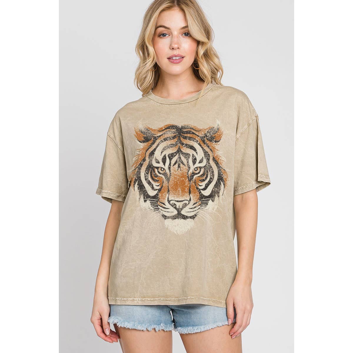A mineral washed, graphic t-shirt with the following features: Vintage-style tiger head and plants graphic print with "Wild Spirit" text print. Round neckline. Short sleeves. Dropped shoulder. Oversized fit. Model Info: Height: 5 ft 9 in | Bust: 32 in | Waist: 25 in | Hips: 34 in | Wearing Size S.