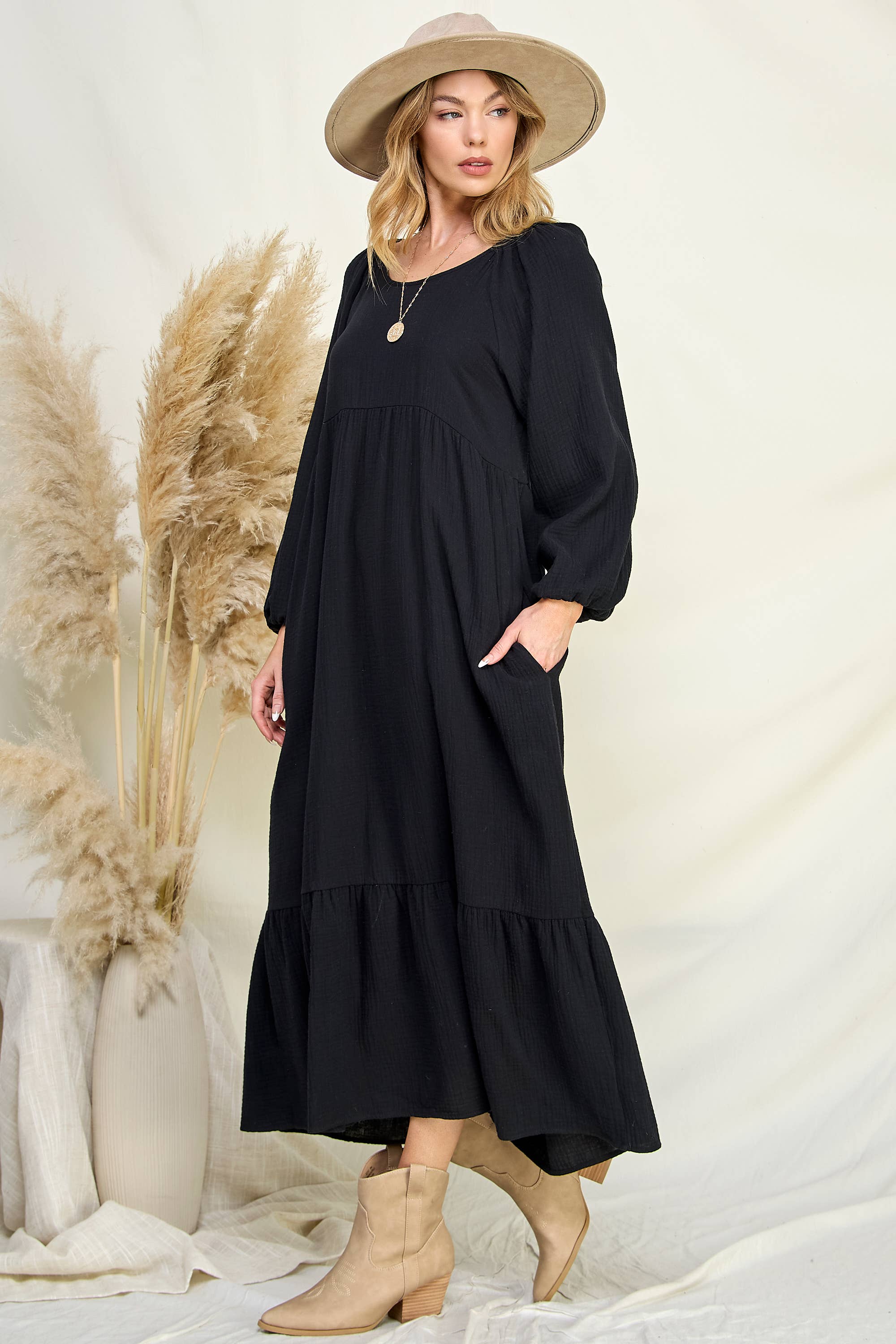 A-Line Swing Trapeze Midi Dress Plus A versatile wardrobe staple that can be dressed up with accessories and heels for a more formal occasion or dressed down with flats for a casual outing. Its stylish design and flattering silhouette make it an ideal choice for various events. - Crew Neckline - 3/4 Sleeves - A-Line Trapeze Silhouette - Midi Length - Relaxed fit - Model is 5’9” and wearing size 1XL.